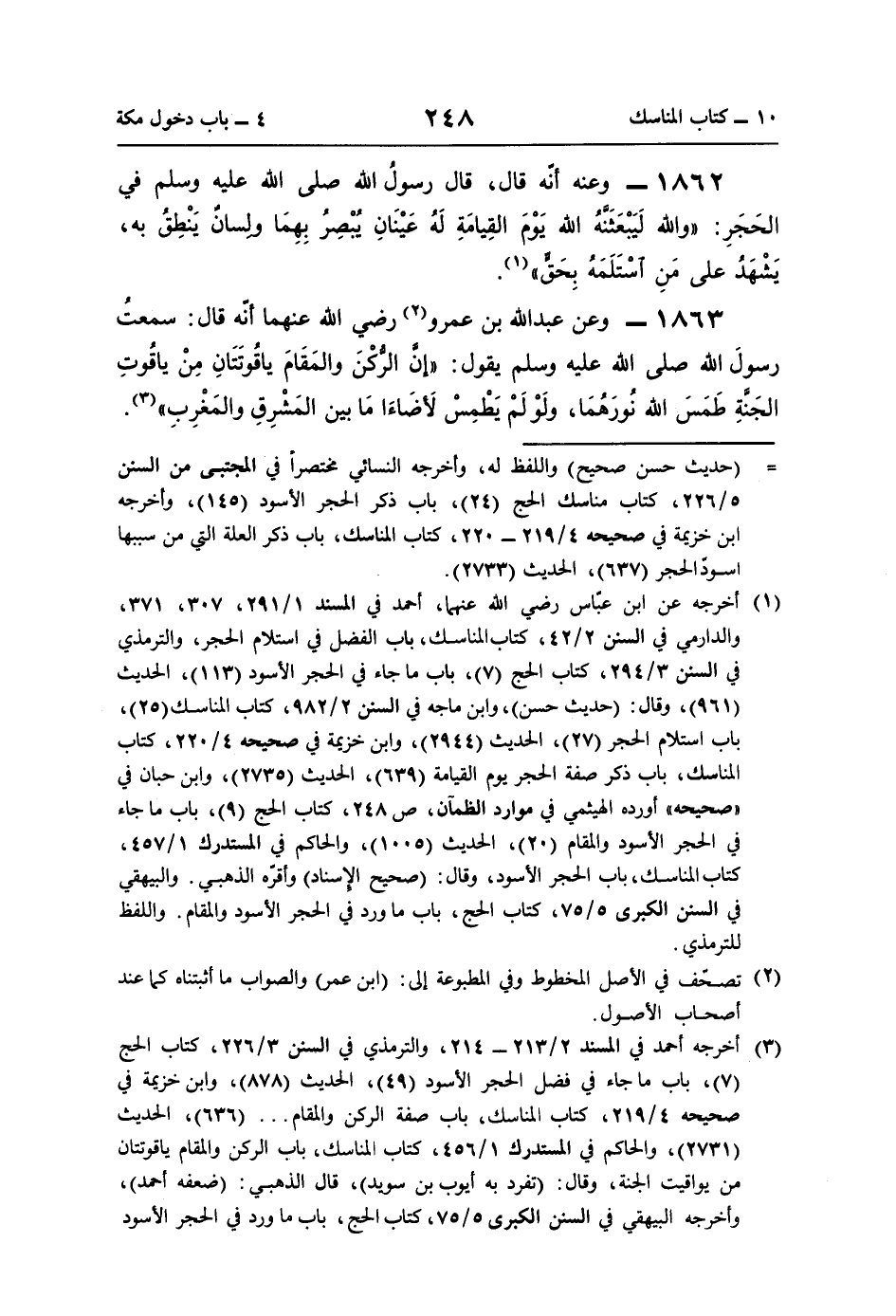 1862 - وعنه أنّه قال، قال رسولُ اللَّه صلى اللَّه عليه وسلم في الحَجَرِ: "واللَّه لَيَبْعَثَنَّهُ اللَّه يَوْمَ القِيامَةِ لَهُ عَيْنَانِ يُبْصِرُ بِهِمَا ولسانٌ يَنْطِقُ به، يَشْهَدُ على مَنِ اسْتَلَمَهُ بِحَقٍّ" (¬1).