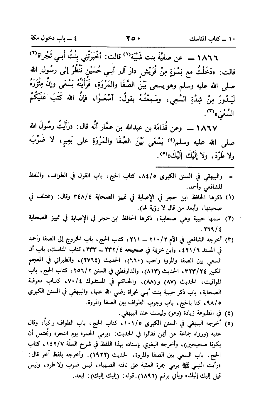 (¬3) أخرجه الشافعي في الأم 2/ 210 - 211، كتاب الحج، باب الخروج إلى الصفا وأحمد في المسند 6/ 421، وابت خزيمة في صحيحه 4/ 232 - 233، كتاب المناسك، باب أن السعي بين الصفا والمروة واجب (660)، الحديث (2764)، والطبراني في المعجم الكبير 24/ 323، الحديث (813)، والدارقطني في السنن 2/ 256، كتاب الحج، باب المواقيت، الحديث (87) و (88)، والحاكم في المستدرك 4/ 70، كتاب معرفة الصحابة، باب ذكر حبيبة بنت أبي تجراة رضي اللَّه عنها، والبيهقي في السنن الكبرى 5/ 98، كتاب الحج، باب وجوب الطواف بين الصفا والمروة.