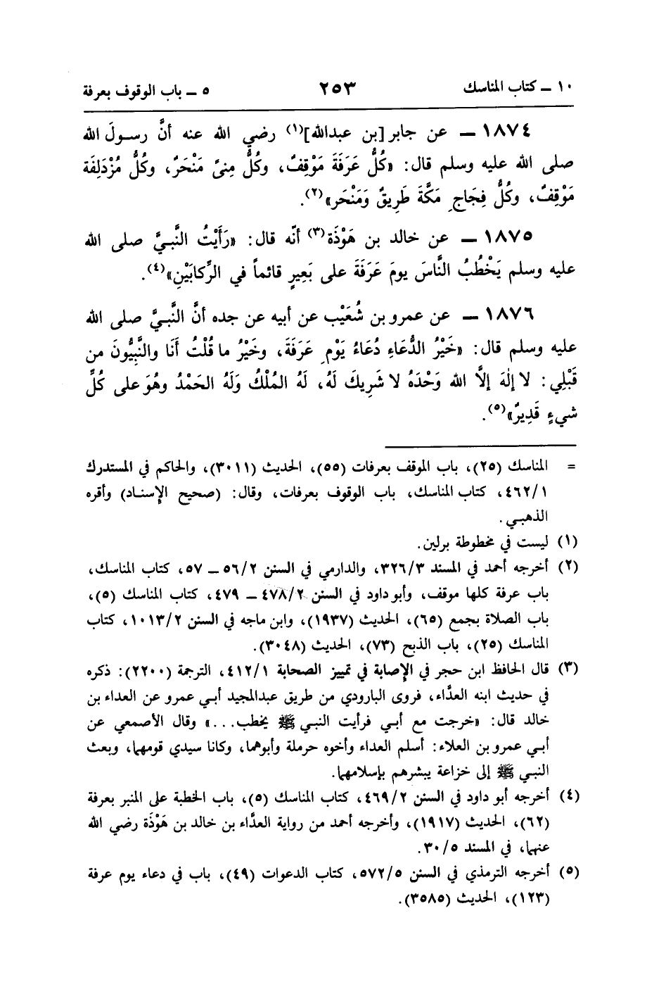= المناسك (25)، باب الموقف بعرفات (55)، الحديث (3011)، والحاكم في المستدرك 1/ 462، كتاب المناسك، باب الوقوف بعرفات، وقال: (صحيح الإسناد) وأقره الذهبي.