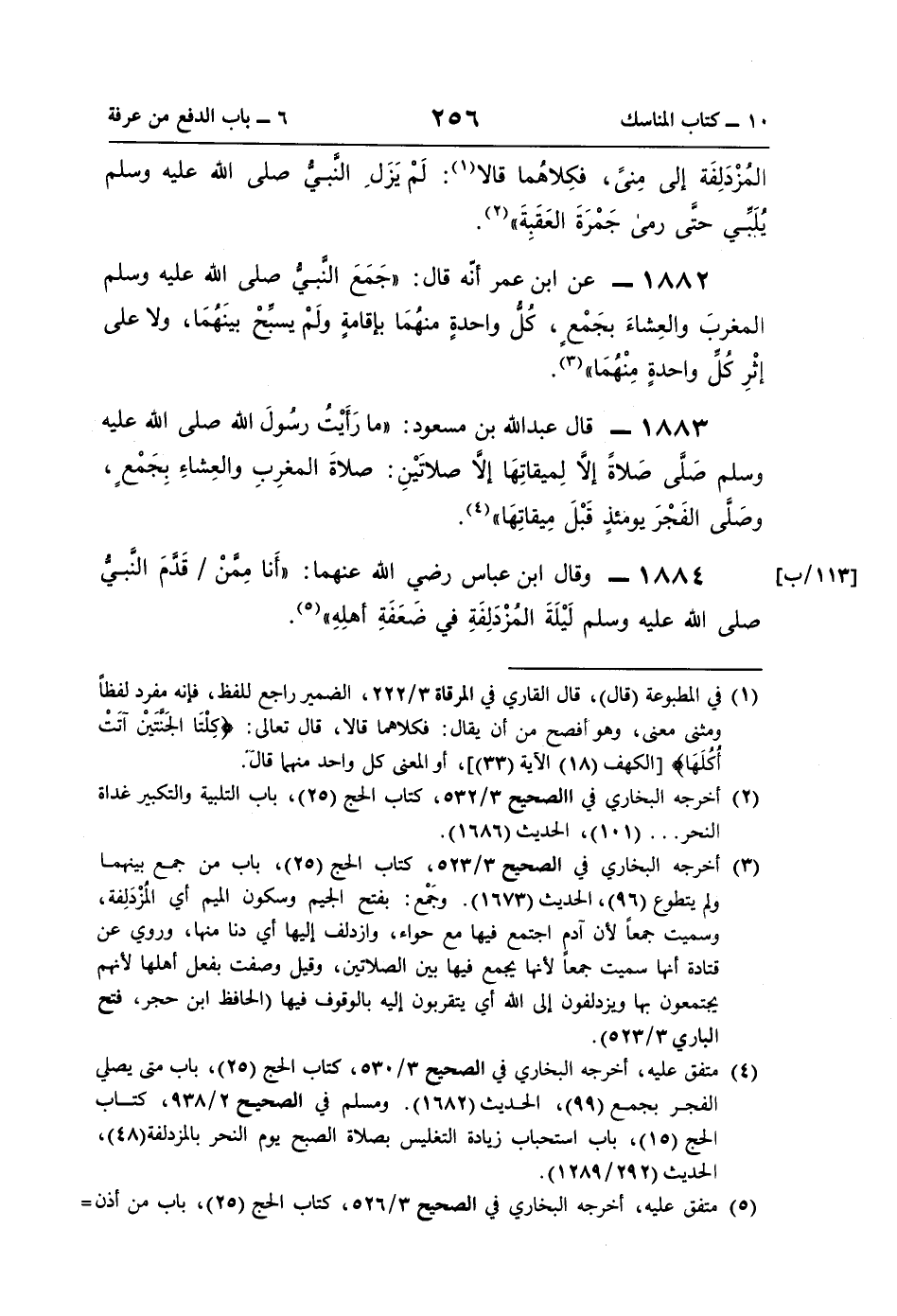 (¬4) متفق عليه، أخرجه البخاري في الصحيح 3/ 530، كتاب الحج (25)، باب متى يصلي الفجر بجمع (99)، الحديث (1682). ومسلم في الصحيح 2/ 938، كتاب الحج (15)، باب استحباب زيادة التغليس بصلاة الصبح يوم النحر بالمزدلفة (48)، الحديث (292/ 1289).