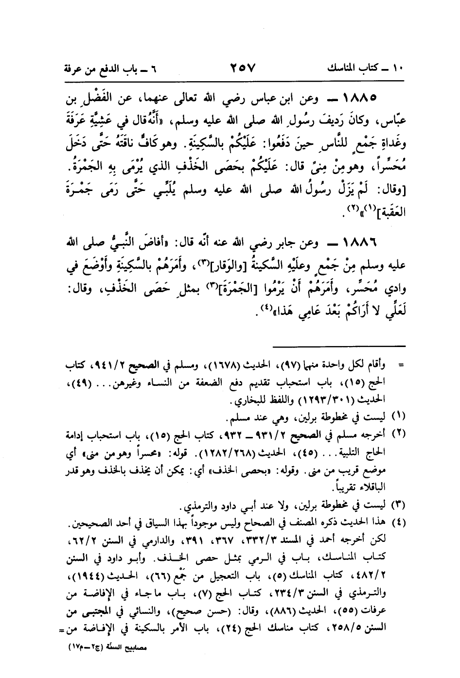 (¬4) هذا الحديث ذكره المصنف في الصحاح وليس موجودًا بهذا السياق في أحد الصحيحين. لكن أخرجه أحمد في المسند 3/ 332، 367، 391، والدارمي في السنن 2/ 62، كتاب المناسك، باب في الرمي بمثل حصى الخذف. وأبو داود في السنن 2/ 482، كتاب المناسك (5)، باب التعجيل من جَمْع (66)، الحديث (1944)، والترمذي في السنن 3/ 234، كتاب الحج (7)، باب ما جاء في الإفاضة من عرفات (55)، الحديث (886)، وقال: (حسن صحيح)، والنسائي في المجتبى من السنن 5/ 258، كتاب مناسك الحج (24)، باب الأمر بالسكينة في الإفاضة من =