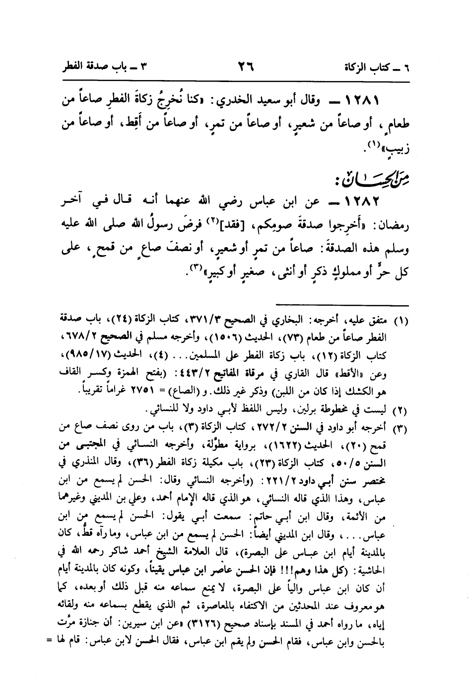 1282 - عن ابن عباس رضي اللَّه عنهما أنه قال في آخر رمضان: "أَخرِجوا صدقةَ صومِكم، [فقد] (¬2) فرضَ رسولُ اللَّه صلى اللَّه عليه وسلم هذه الصدقةَ: صاعًا من تمرٍ أو شعيرٍ، أو نصفَ صاعٍ من قمحٍ، على كل حرٍّ أو مملوكٍ ذكرٍ أو أنثى، صغيرٍ أو كبيرٍ" (¬3).