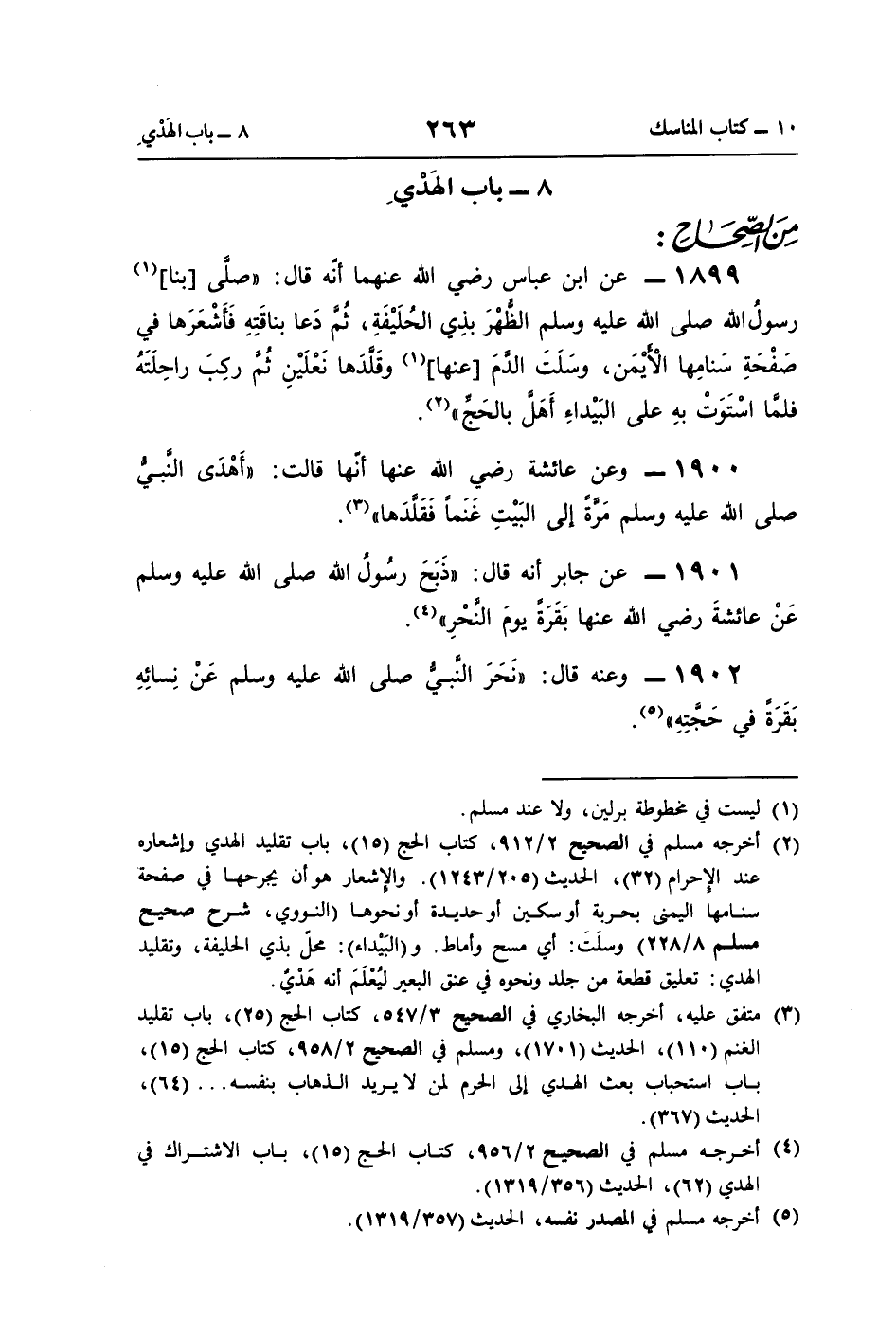 (¬2) أخرجه مسلم في الصحيح 2/ 912، كتاب الحج (15)، باب تقليد الهدي وإشعاره عند الإحرام (32)، الحديث (205/ 1243). والإشعار هو أن يجرحها في صفحة سنامها اليمنى بحربة أو سكين أو حديدة أو نحوها (النووي، شرح صحيح مسلم 8/ 228) وسلَتَ: أي مسح وأماط، و (البَيْداء): محل بذي الحليفة، وتقليد الهدي: تعليق قطعة من جلد ونحوه في عنق البعير ليُعْلَمَ أنه هَدْيٌ.