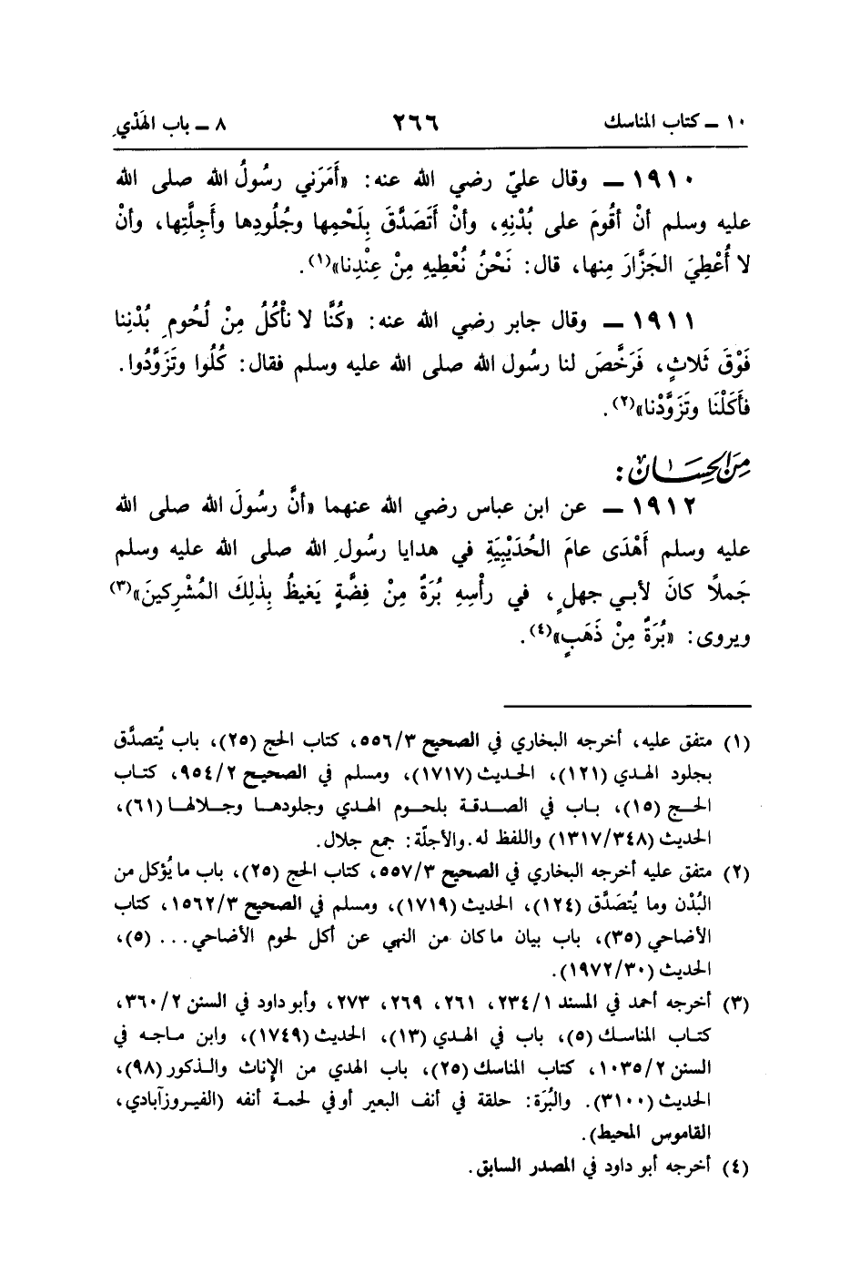 1912 - عن ابن عباس رضي اللَّه عنهما "أنَّ رسُولَ اللَّه صلى اللَّه عليه وسلم أَهْدَى عامَ الحُدَيْبِيَةِ في هدايا رسُولِ اللَّه صلى اللَّه عليه وسلم جَملًا كانَ لأبي جهل، في رأْسِهِ بُرَةٌ مِنْ فِضَّةٍ يَغيظُ بِذلِكَ المُشْرِكينَ" (¬3) ويروى: "بُرَةٌ مِنْ ذَهَبٍ" (¬4).