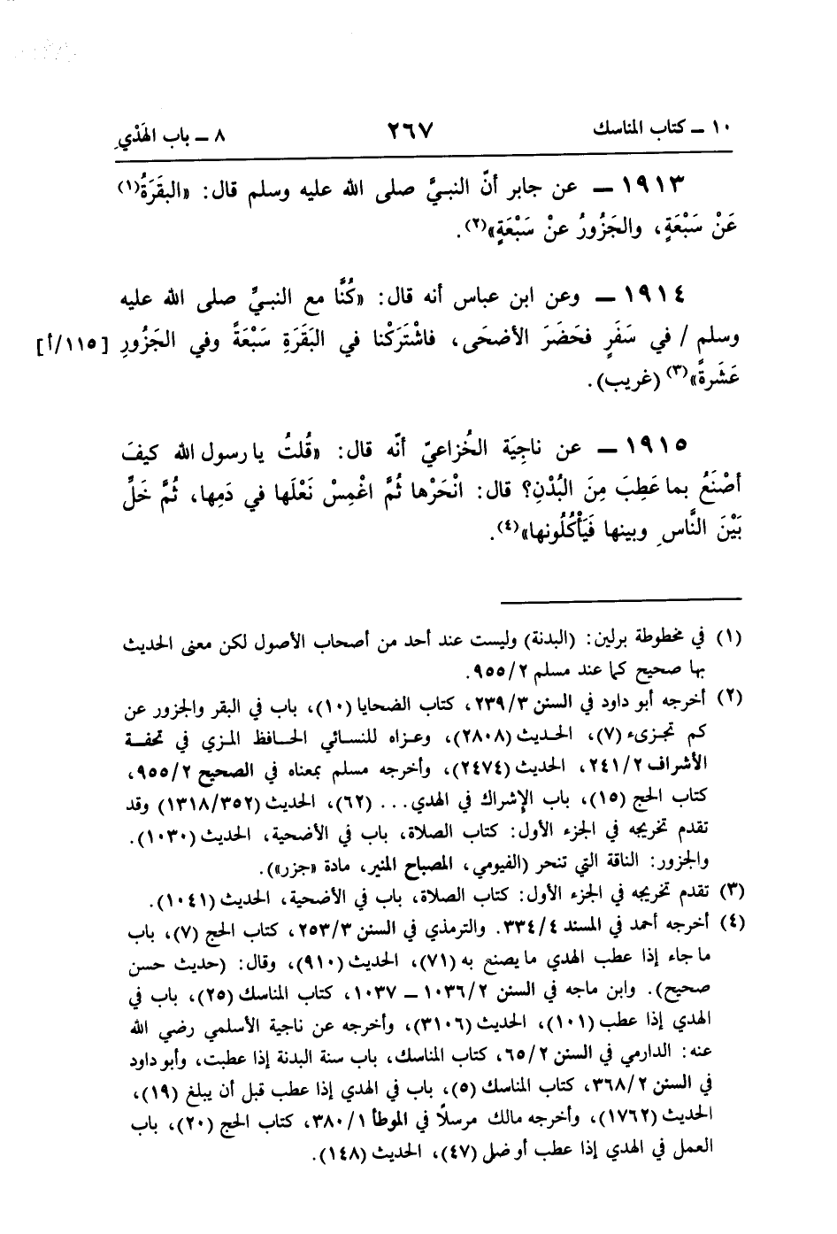 1915 - عن ناجِيَة الخُزاعيّ أنّه قال: "قُلتُ يا رسول اللَّه كيفَ أصْنَعُ بما عَطِبَ مِنَ البُدْنِ؟ قال: انْحَرْها ثُمَّ اغْمِسْ نَعْلَها في دَمِها، ثُمَّ خَلِّ بَيْنَ النَّاسِ وبينها فَيَأْكُلُونها" (¬4).