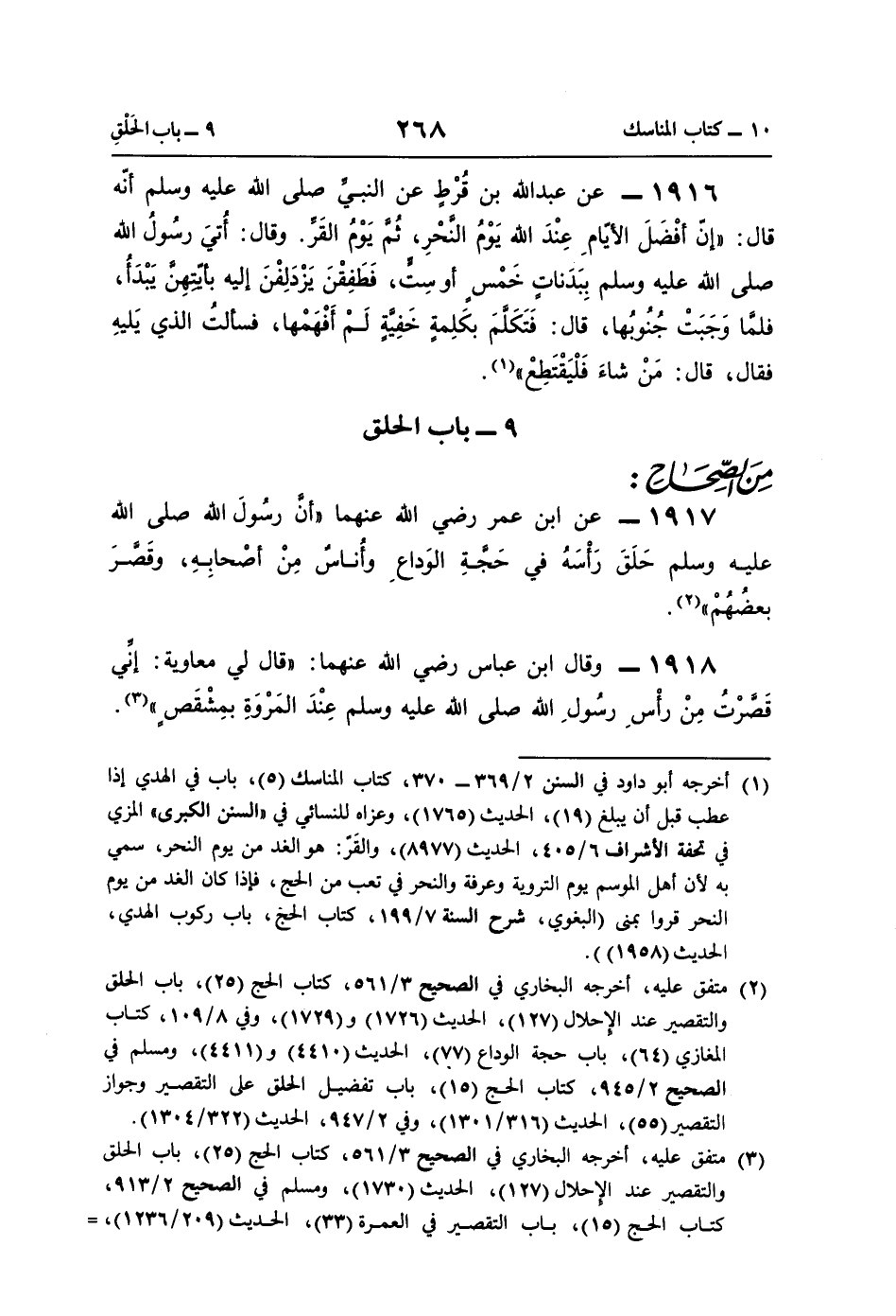 1917 - عن ابن عمر رضي اللَّه عنهما "أنَّ رسُولَ اللَّه صلى اللَّه عليه وسلم حَلَقَ رَأْسَهُ في حَجَّةِ الوَداعِ وأُناسٌ مِنْ أصْحابِهِ، وقَصَّرَ بعضُهُمْ" (¬2).