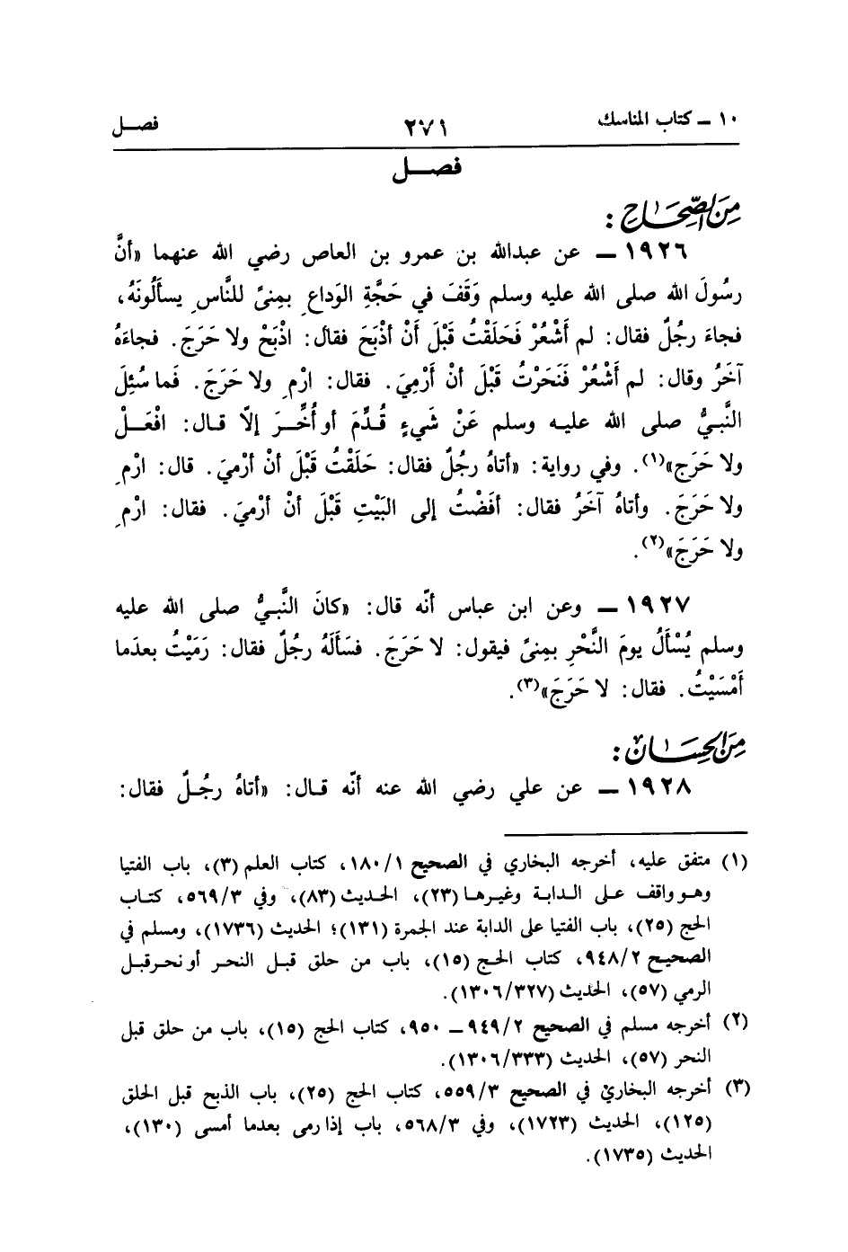 (¬1) متفق عليه، أخرجه البخاري في الصحيح 1/ 180، كتاب العلم (3)، باب الفتيا وهو واقف على الدابة وغيرها (23)، الحديث (83)، وفي 3/ 569، كتاب الحج (25)، باب الفتيا على الدابة عند الجمرة (131) , الحديث (1736)، ومسلم في الصحيح 2/ 948، كتاب الحج (15)، باب من حلق قبل النحر أو نحر قبل الرمي (57)، الحديث (327/ 1306).