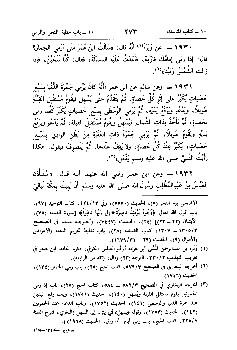 1931 - وعن سالم عن ابن عمر "أنَّهُ كانَ يَرْمي جَمْرَةَ الدُّنْيا بِسَبْعِ حَصَياتٍ يُكَبِّرُ على إثْرِ كُلِّ حَصاةٍ، ثُمَّ يَتَقَدمُ حتَّى يُسْهِلَ فيقُومُ مُسْتَقْبِلَ القِبْلَةِ طَويلًا، وَيَدْعُو وَيَرْفَعُ يَدَيْهِ، ثُمَّ يَرْمي الوُسْطَى بِسَبْعِ حَصَياتٍ يُكَبِّرُ كُلَّما رَمَى بحَصاةٍ، ثُمَّ يَأخُذُ بِذاتِ الشِّمالِ فيُسْهِلُ ويقُومُ مُسْتَقبِلَ القبلة، ثُمَّ يَدْعُو وَيَرْفَعُ يَدَيْهِ ويَقُومُ طَويلًا، ثُمَّ يَرْيِر جَمْرَةَ ذاتِ العَقَبَةِ مِنْ بَطْنِ الوادِي بِسَبْعِ حَصَياتٍ، يُكَبِّرُ عِنْدَ كُل حَصاةٍ، ولا يَقِفُ عِنْدَها، ثُمَّ يَنْصَرِفُ فيقول: هكذا رَأَيْتُ النَّبيَّ صلى اللَّه عليه وسلم يَفْعَل" (¬3).