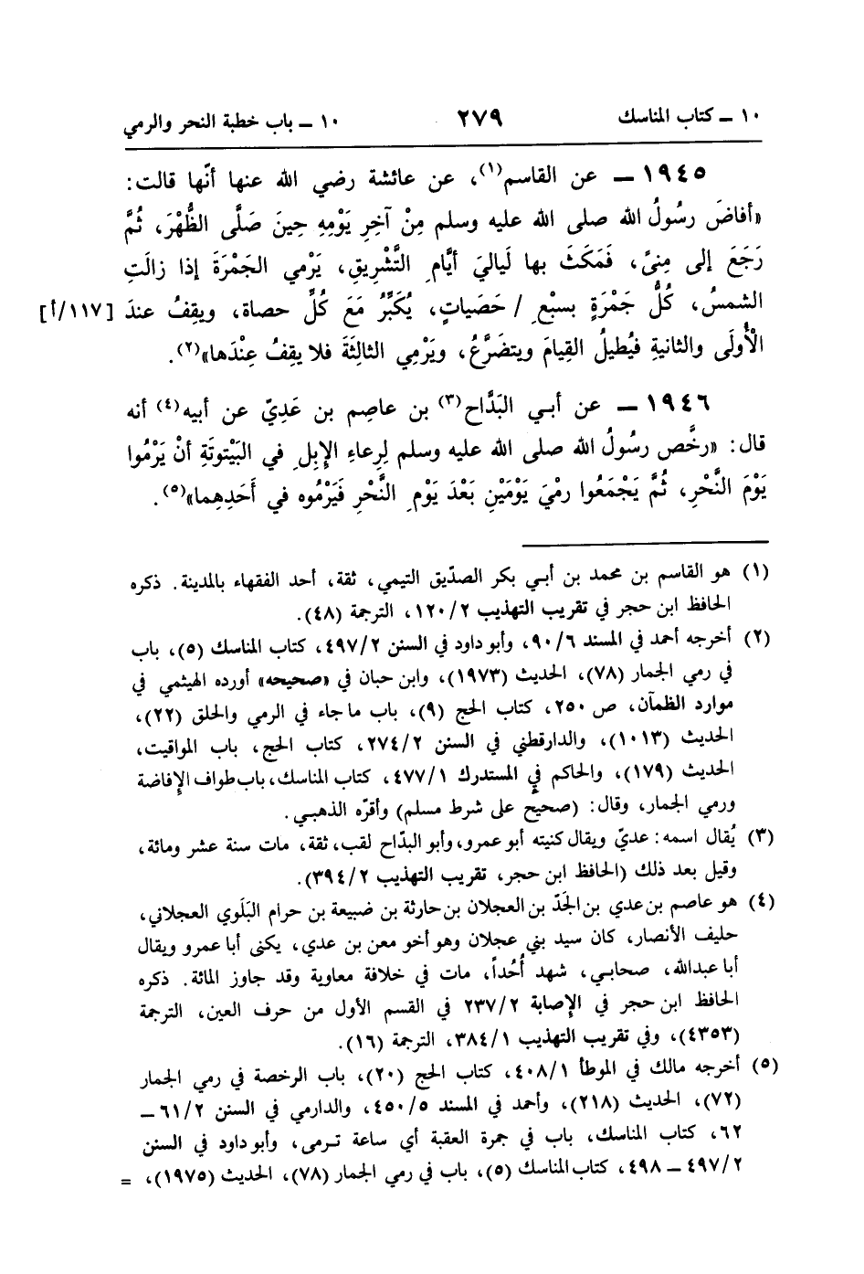 1946 - عن أبي البداح (¬3) بن عاصِم بن عَدِيّ عن أبيه (¬4) أنه قال: "رخَّص رسُولُ اللَّه صلى اللَّه عليه وسلم لِرِعاءِ الإبِلِ في البَيْتوتَةِ أنْ يَرْمُوا يَوْمَ النَّحْرِ، ثُمَّ يَجْمَعُوا رمْيَ يَوْمَيْنِ بَعْدَ يَوْمِ النَّحْرِ فَيَرْمُوه في أَحَدِهِما" (¬5).