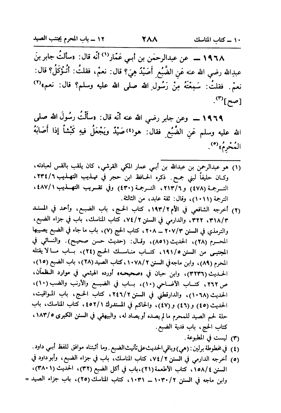 (¬2) أخرجه الشافعي في الأم 2/ 193، كتاب الحج، باب الضبع، وأحمد في المسند 3/ 318، 322، والدارمي في السنن 2/ 74، كتاب المناسك، باب في جزاء الضبع، والترمذي في السنن 3/ 207 - 208، كتاب الحج (7)، باب ما جاء في الضبع يصيبها المحرم (28)، الحديث (851)، وقال: (حديث حسن صحيح). والنسائي في المجتبى من السنن 5/ 191، كتاب مناسك الحج (24)، باب ما لا يقتله المحرم (89)، وابن ماجه في السنن 2/ 1078، كتاب الصيد (28)، باب الضبع (15)، الحديث (3236)، وابن حبان في "صحيحه" أورده الهيثمي في موارد الظمآن، ص 262، كتاب الأضاحي (10)، باب في الضبع والأرنب والضب (10)، الحديث (1068)، والدارقطني في السنن 2/ 246، كتاب الحج، باب المواقيت، الحديث (45) و (46) و (47)، والحاكم في المستدرك 1/ 452، كتاب المناسك، باب حلة لحم الصيد للمحرم ما لم يصده أو يصاد له، والبيهقي في السنن الكبرى 5/ 183، كتاب الحج، باب فدية الضبع.