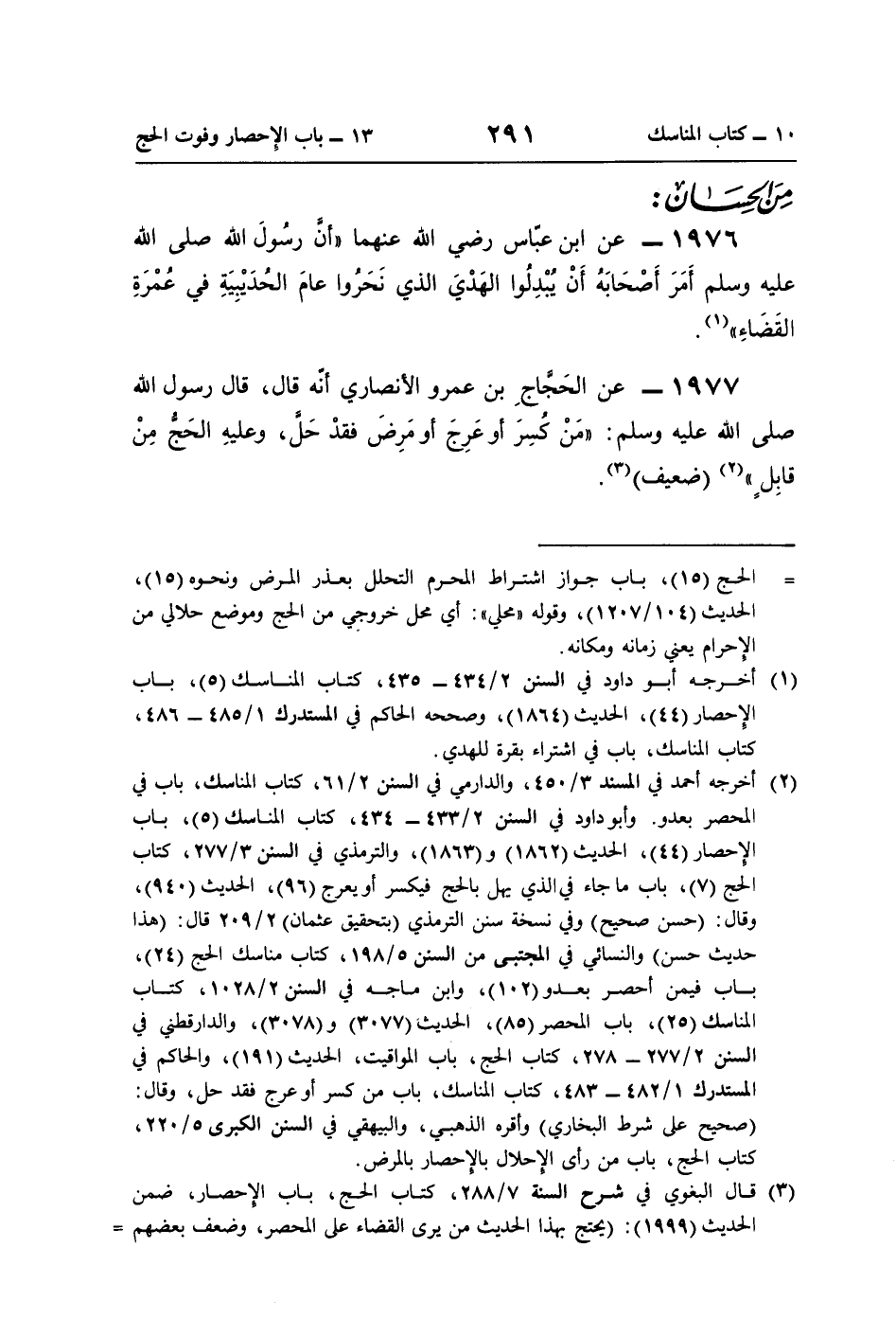 1977 - عن الحَجَّاجِ بن عمرو الأنصاري أنّه قال، قال رسول اللَّه صلى اللَّه عليه وسلم: "مَنْ كُسِرَ أو عَرِجَ أو مَرِضَ فقدْ حَلَّ، وعليهِ الحَجُّ مِنْ قابِلٍ" (¬2) (ضعيف) (¬3).