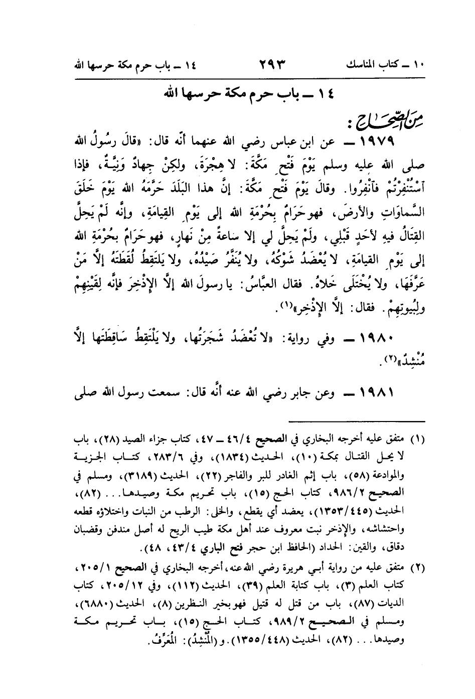 1979 - عن ابن عباس رضي اللَّه عنهما أنّه قال: "قالَ رسُولُ اللَّه صلى اللَّه عليه وسلم يَوْمَ فَتْح مَكَّةَ: لا هِجْرَةَ، ولكِنْ جِهادٌ وَنيَّةٌ، فإذا اسْتُنْفِرْتُمْ فَانْفِرُوا. وقالَ يَوْمَ فَتْحِ مَكَّةَ: إنَّ هذا البَلَدَ حَرمَهُ اللَّه يَوْمَ خَلَقَ السَّماوَاتِ والأرضَ، فهو حَرَامٌ بِحُرْمَةِ اللَّه إلى يَوْمِ القِيامَةِ، وإنَّه لَمْ يَحِلَّ القِتَالُ فيهِ لأحَدٍ قَبْلِي، ولَمْ يَحِل لي إلا ساعةً مِنْ نَهارٍ، فهو حَرَامٌ بحُرْمَةِ اللَّه إلى يَوْمِ القيامَةِ، لا يُعْضَدُ شَوْكُهُ، ولا يُنَفرُ صَيْدُهُ، ولا يَلتَقِطُ لُقَطَتَهُ إلَّا مَنْ عَرَّفَهَا، ولا يُخْتَلَى خَلاهُ. فقال العبَّاسُ: يا رسولَ اللَّه إلَّا الإذْخِرَ فإنَّه لِقَيْنهِمْ ولِبُيوتهمْ. فقال: إلَّا الإِذْخِر" (¬1).