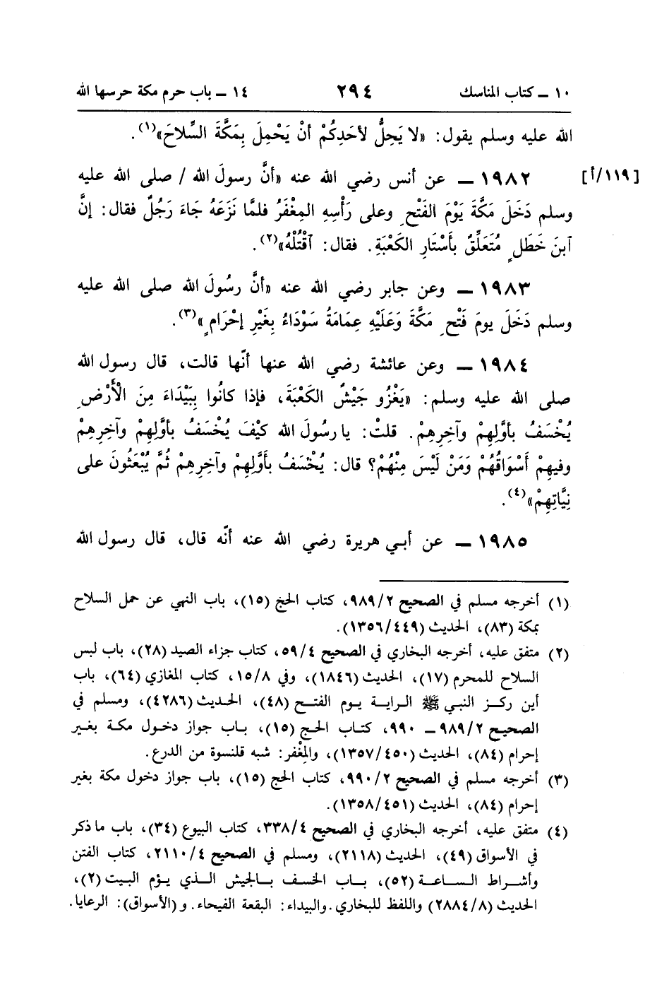 (¬1) أخرجه مسلم في الصحيح 2/ 989، كتاب الحج (15)، باب النهي عن حمل السلاح بمكة (83)، الحديث (449/ 1356).