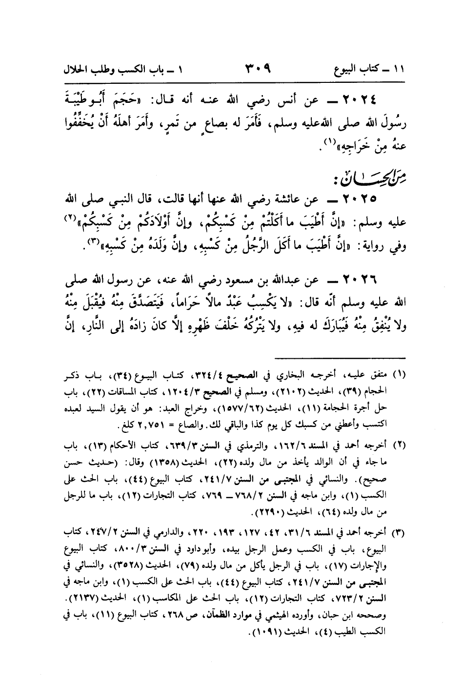 2025 - عن عائشة رضي اللَّه عنها أنَّها قالت، قال النبي صلى اللَّه عليه وسلم: "إنَّ أَطْيَبَ ما أَكَلْتُمْ مِنْ كَسْبِكُمْ، وإنَّ أَوْلاَدَكُمْ مِنْ كَسْبِكُمْ" (¬2) وفي رواية: "إنَّ أَطْيَبَ ما أَكَلَ الرَّجُلُ مِنْ كَسْبِهِ، وإنَّ وَلَدَهُ مِنْ كَسْبِهِ" (¬3).