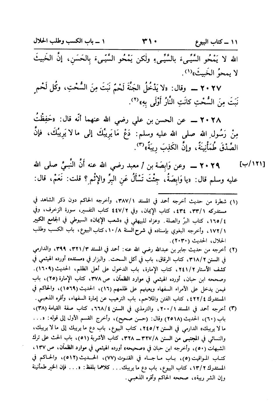 (¬3) أخرجه أحمد في المسند 1/ 200، والترمذي في السنن 4/ 668، كتاب صفة القيامة (38)، باب (60)، الحديث (2518) وقال: (حسن صحيح)، وأخرج القسم الأول إلى قوله: ". . . ما لا يريبك" الدارمي في السنن 2/ 245، كتاب البيوع، باب دع ما يريبك إلى ما لا يريبك، والنسائي في المجتبى من السنن 8/ 327 - 328، كتاب الأشربة (51)، باب الحث على ترك الشبهات (50)، وأخرجه ابن حبان في "صحيحه" أورده الهيثمي في موارد الظمآن، ص 137، كتاب المواقيت (5)، باب ما جاء في القنوت (77)، الحديث (512)، والحاكم في المستدرك 2/ 13، كتاب البيوع، باب دع ما يريبك. . . كلاهما بلفظ: ". . . فإن الخير طمأنينة وإن الشر ريبة"، صححه الحاكم وأقره الذهبي.