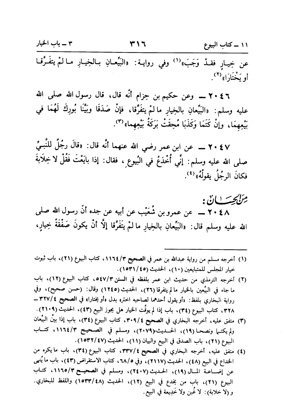 (¬2) أخرجه الترمذي من حديث ابن عمر بلفظه في السنن 3/ 547، كتاب البيوع (12)، باب ما جاء في البيعين بالخيار ما لم يتفرقا (26)، الحديث (1245) وقال: (حسن صحيح)، وفي رواية البخاري بلفظ: "أو يقول أحدهما لصاحبه اختر" بدل "أو يختارا" في الصحيح 4/ 327 - 328، كتاب البيوع (34)، باب إذا لم يوقِّت الخيار هل يجوز البيع (43)، الحديث (2109).