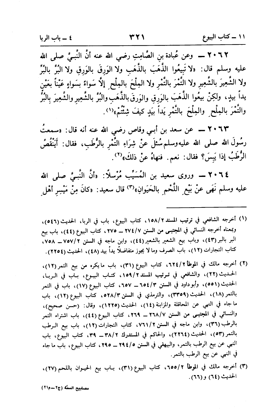 2063 - عن سعد بن أبي وقاص رضي اللَّه عنه أنّه قال: "سمعتُ رسُولَ اللَّه صلى اللَّه عليه وسلم سُئلَ عنْ شِرَاءِ التَّمْرِ بالرُّطَبِ، فقال: أَيَنْقُصُ الرُّطَبُ إذا يَبِسَ؟ فقال: نعم. فنهاهُ عنْ ذلكَ" (¬2).