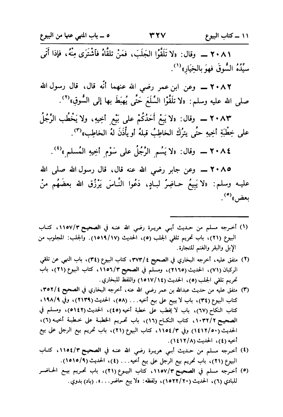 (¬5) أخرجه مسلم في الصحيح 3/ 1157، كتاب البيوع (21)، باب تحريم بيع الحاضر للبادي (6)، الحديث (20/ 1522)، ولفظه: "لا يبع حاضر. . . ". (باد) بدوي.