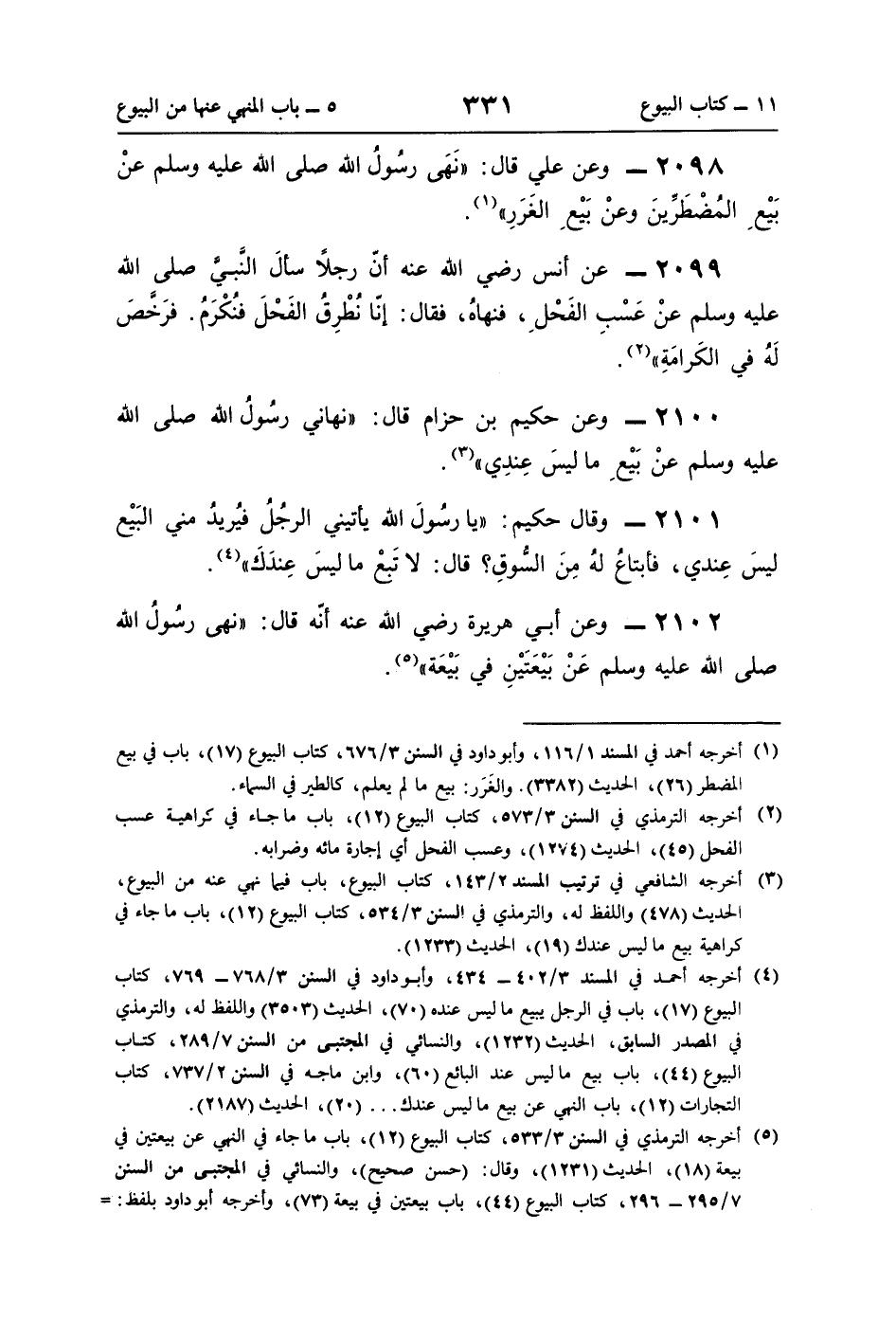 2098 - وعن علي قال: "نَهَى رسُولُ اللَّه صلى اللَّه عليه وسلم عنْ بَيْعَ المُضْطَرِّينَ وعنْ بَيْعَ الغَرَرِ" (¬1).