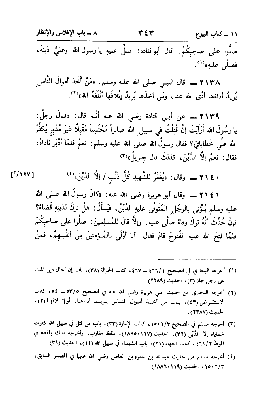 (¬3) أخرجه مسلم في الصحيح 3/ 1501، كتاب الإمارة (33)، باب من قتل في سبيل اللَّه كفرت خطاياه إلّا الدَّيْن (32)، الحديث (117/ 1885)، بلفظ مقارب، وأخرجه مالك بلفظه في الموطأ 2/ 461، كتاب الجهاد (21)، باب الشهداء في سبيل اللَّه (14)، الحديث (31).