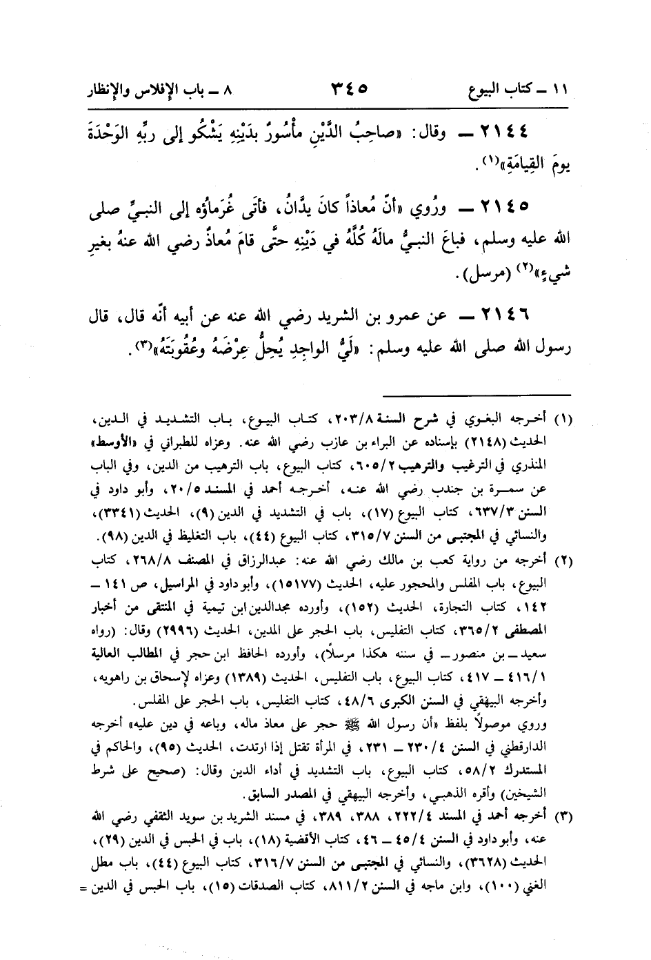 (¬2) أخرجه من رواية كعب بن مالك رضي اللَّه عنه: عبد الرزاق في المصنف 8/ 268، كتاب البيوع، باب المفلس والمحجور عليه، الحديث (15177)، وأبو داود في المراسيل، ص 141 - 142، كتاب التجارة، الحديث (152)، وأورده مجد الدين ابن تيمية في المنتقى من أخبار المصطفى 2/ 365، كتاب التفليس، باب الحجر على المدين، الحديث (2996) وقال: (رواه سعيد -بن منصور- في سننه هكذا مرسلًا)، وأورده الحافظ ابن حجر في المطالب العالية 1/ 416 - 417، كتاب البيوع، باب التفليس، الحديث (1389) وعزاه لإسحاق بن راهويه، وأخرجه البيهقي في السنن الكبرى 6/ 48، كتاب التفليس، باب الحجر على المفلس.