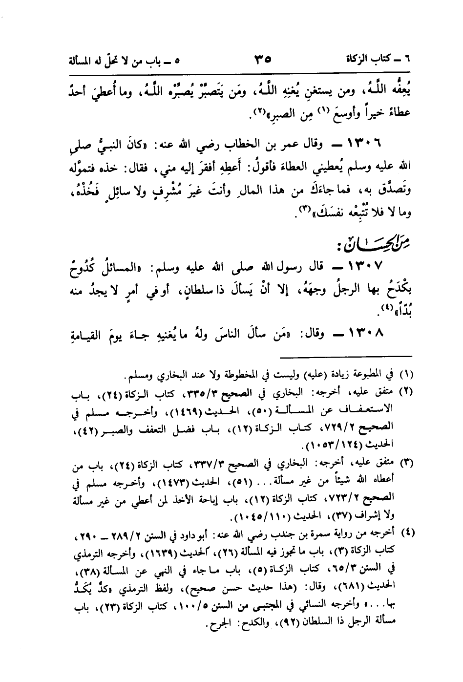 1307 - قال رسول اللَّه صلى اللَّه عليه وسلم: "المسائلُ كُدُوحٌ يكْدَحُ بها الرجلُ وجهَهُ، إلا أنْ يَسألَ ذا سلطانٍ، أو في أمرٍ لا يجدُ منه بُدًّا" (¬4).