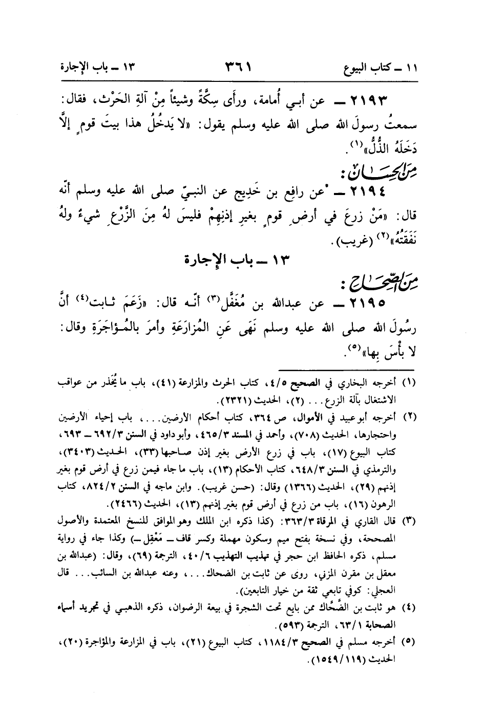 2195 - عن عبد اللَّه بن مُغَفَّل (¬3) أنّه قال: "زَعَمَ ثابت (¬4) أنَّ رسُولَ اللَّه صلى اللَّه عليه وسلم نَهَى عَنِ المُزارَعَةِ وأمرَ بالمُؤاجَرَةِ وقال: لا بأْسَ بِها" (¬5).