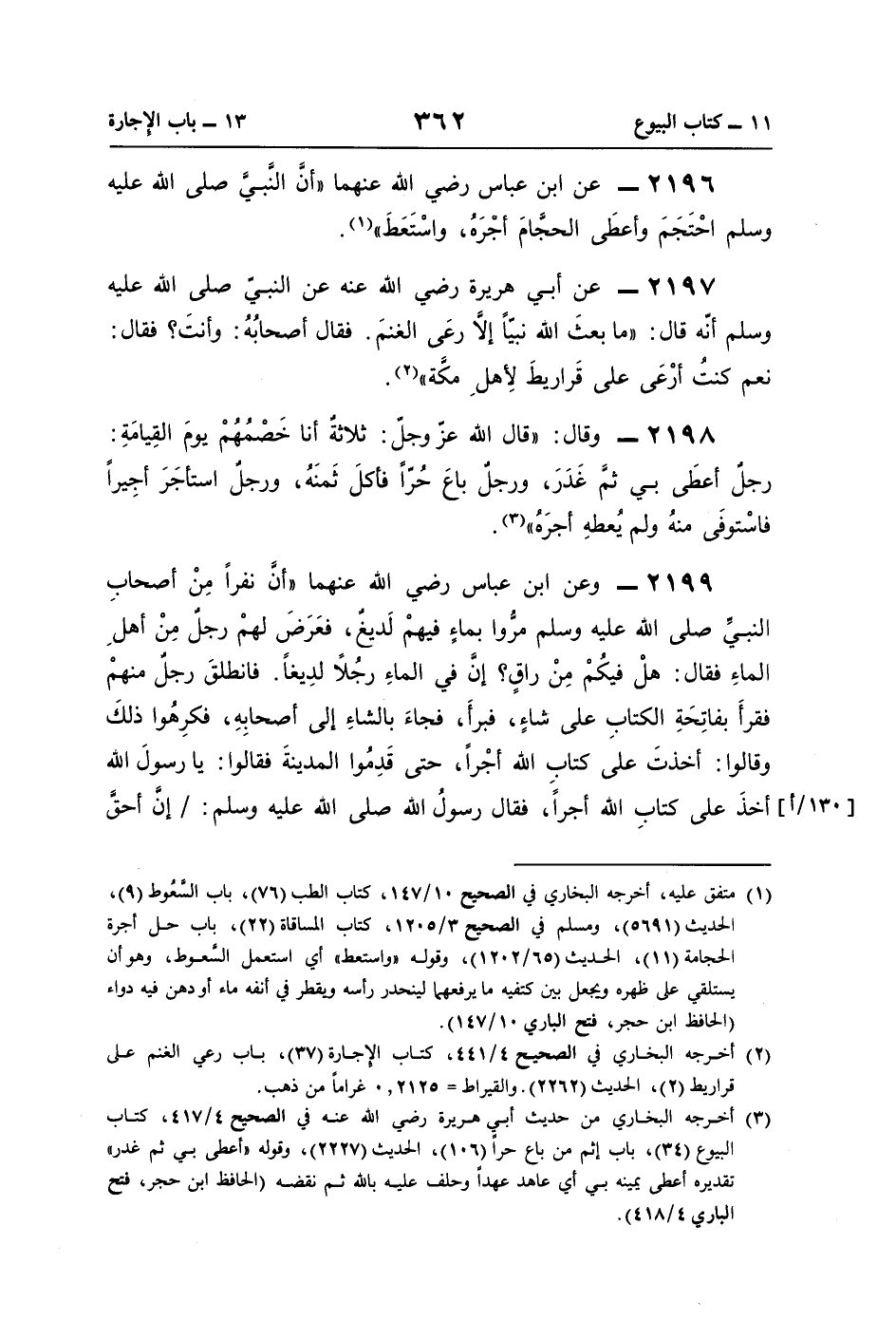 2199 - وعن ابن عباس رضي اللَّه عنهما "أنَّ نفرًا مِنْ أصحابِ النبيِّ صلى اللَّه عليه وسلم مرُّوا بماءٍ فيهمْ لَديغٌ، فعَرَضَ لهمْ رجلٌ مِنْ أهلِ الماءِ فقال: هلْ فيكُمْ مِنْ راقٍ؟ إنَّ في الماءِ رجُلًا لدِيغًا. فانطلقَ رجلٌ منهمْ فقرأَ بفاتِحَةِ الكتابِ على شاءٍ، فبرأَ، فجاءَ بالشاءِ إلى أصحابِهِ، فكرِهُوا ذلكَ وقالوا: أخذتَ على كتابِ اللَّه أجْرًا، حتَّى قَدِمُوا المدينةَ فقالوا: يا رسولَ اللَّه أخذَ على كتابِ اللَّه أجرًا، فقال رسولُ اللَّه صلى اللَّه عليه وسلم: إنَّ أحقَّ
