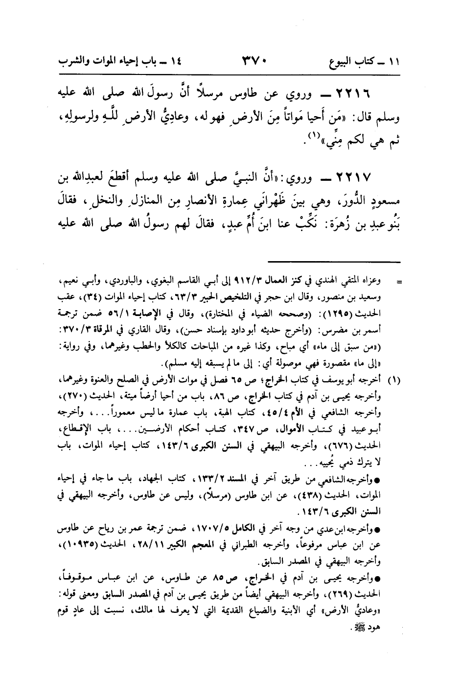 • وأخرجه يحيى بن آدم في الخراج، ص 85 عن طاوس، عن ابن عباس موقوفًا، الحديث (269)، وأخرجه البيهقي أيضًا من طريق يحيى بن آدم في المصدر السابق ومعنى قوله: "وعاديُّ الأرض" أي الأبنية والضياع القديمة التي لا يعرف لها مالك، نسبت إلى عادٍ قوم هود -صلى اللَّه عليه وسلم-.