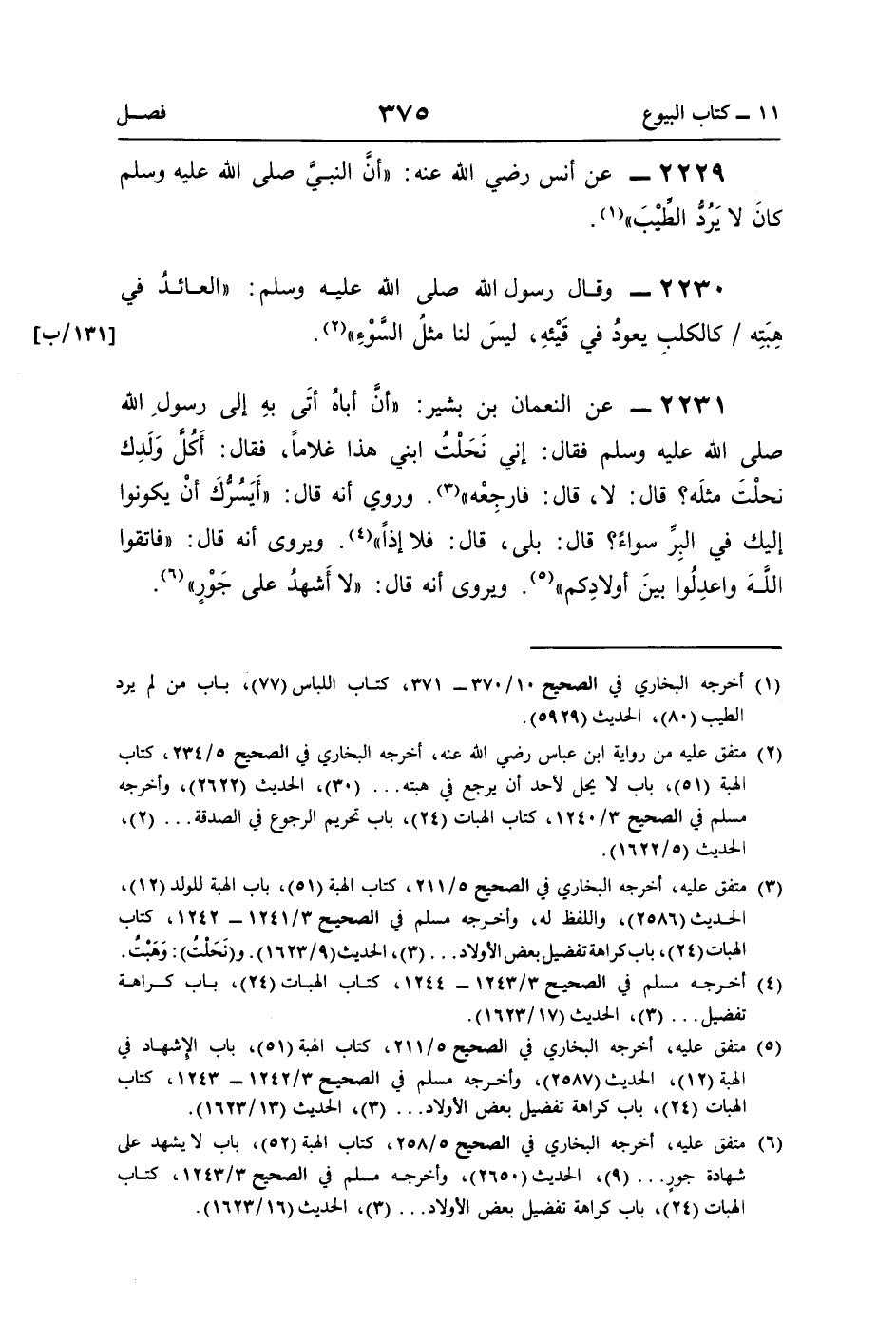 2231 - عن النعمان بن بشير: "أنَّ أباهُ أتَى بهِ إلى رسولِ اللَّه صلى اللَّه عليه وسلم فقال: إني نَحَلْتُ ابني هذا غلامًا، فقال: أَكُلَّ وَلَدِك نحلْتَ مثلَه؟ قال: لا، قال: فارجِعْه" (¬3). وروي أنّه قال: "أَيَسُرُّكَ أنْ يكونوا إليك في البِرِّ سواءً؟ قال: بلى، قال: فلا إذًا" (¬4). ويروى أنّه قال: "فاتقوا اللهَ واعدِلُوا بينَ أولادِكم" (¬5). ويروى أنّه قال: "لا أَشهدُ على جَوْرٍ" (¬6).