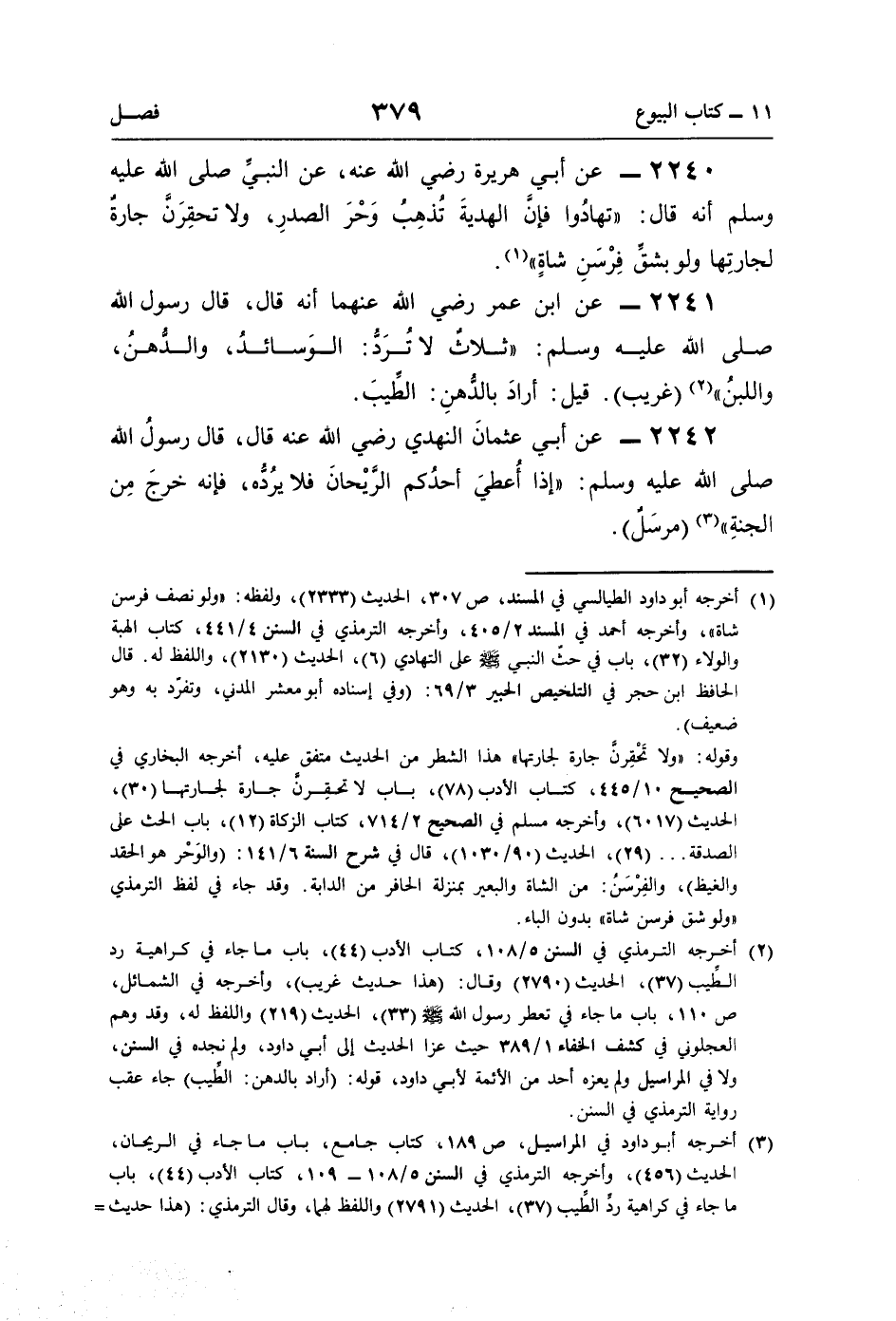 2241 - عن ابن عمر رضي اللَّه عنهما أنّه قال، قال رسول اللَّه صلى اللَّه عليه وسلم: "ثلاثٌ لا تُرَدُّ: الوَسائدُ، والدُّهنُ، واللبنُ" (¬2) (غريب). قيل: أرادَ بالدُّهنِ: الطِّيبَ.