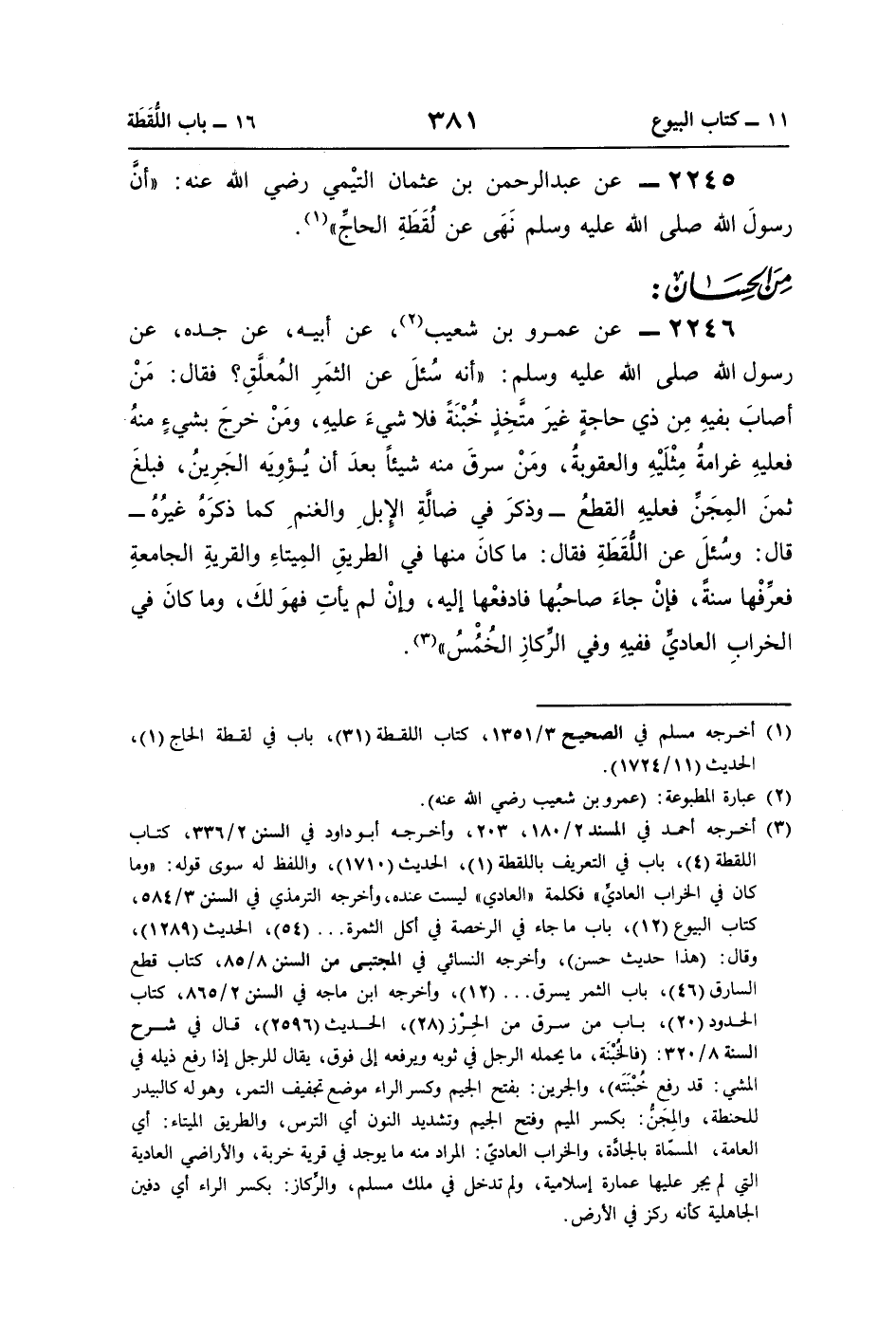 2246 - عن عمرو بن شعيب (¬2)، عن أبيه، عن جده، عن رسول اللَّه صلى اللَّه عليه وسلم: "أنَّه سُئلَ عن الثمَرِ المُعلَّقِ؟ فقال: مَنْ أصابَ بفيهِ مِن ذي حاجةٍ غيرَ متَّخِذٍ خُبْنَةً فلا شيءَ عليهِ، ومَنْ خرجَ بشيءٍ منهُ فعليهِ غرامةُ مِثْلَيْهِ والعقوبةُ، ومَنْ سرقَ منه شيئًا بعدَ أن يُؤوِيَه الجَرِينُ، فبلغَ ثمنَ المِجَنِّ فعليهِ القطعُ -وذكرَ في ضالَّةِ الإِبلِ والغنمِ كما ذكرَهُ غيرُهُ- قال: وسُئلَ عن اللُّقَطَةِ فقال: ما كانَ منها في الطريقِ المِيتاءِ والقريةِ الجامعةِ فعرِّفْها سنةً، فإنْ جاءَ صاحبُها فادفعْها إليه، وإنْ لم يأتِ فهوَ لكَ، وما كانَ في الخرابِ العاديِّ ففيهِ وفي الرِّكازِ الخُمُسُ" (¬3).
