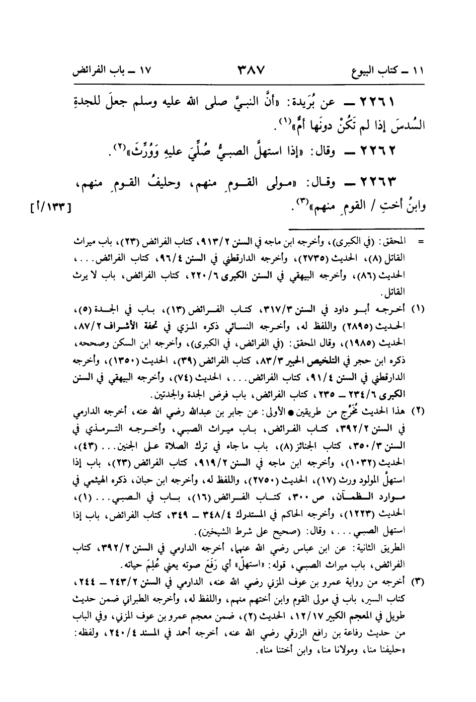 • الأولى: عن جابر بن عبد اللَّه رضي اللَّه عنه، أخرجه الدارمي في السنن 2/ 392، كتاب الفرائض، باب ميراث الصبي، وأخرجه الترمذي في السنن 3/ 350، كتاب الجنائز (8)، باب ما جاء في ترك الصلاة على الجنين. . . (43)، الحديث (1032)، وأخرجه ابن ماجه في السنن 2/ 919، كتاب الفرائض (23)، باب إذا استهل المولود ورث (17)، الحديث (2750)، واللفظ له، وأخرجه ابن حبان، ذكره الهيثمي في موارد الظمآن، ص 300، كتاب الفرائض (16)، باب في الصبي. . . (1)، الحديث (1223)، وأخرجه الحاكم في المستدرك 4/ 348 - 349، كتاب الفرائض، باب إذا استهل الصبي. . .، وقال: (صحيح على شرط الشيخين).