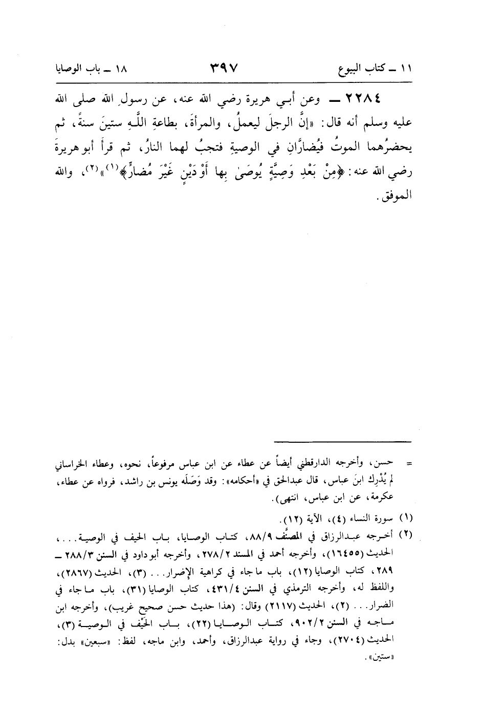 2284 - وعن أبي هريرة رضي اللَّه عنه، عن رسولِ اللَّه صلى اللَّه عليه وسلم أنّه قال: "إنَّ الرجلَ ليعملُ، والمرأةَ، بطاعةِ اللَّه ستينَ سنةً، ثمَّ يحضرُهما الموتُ فيُضارَّانِ في الوصيةِ فتجبُ لهما النارُ، ثمَّ قرأَ أبو هريرةَ رضي اللَّه عنه: {مِنْ بَعْدِ وَصِيَّةٍ يُوصَى بِهَا أَوْ دَيْنٍ غَيْرَ مُضَارٍّ} (¬1) " (¬2)، واللَّه الموفق.