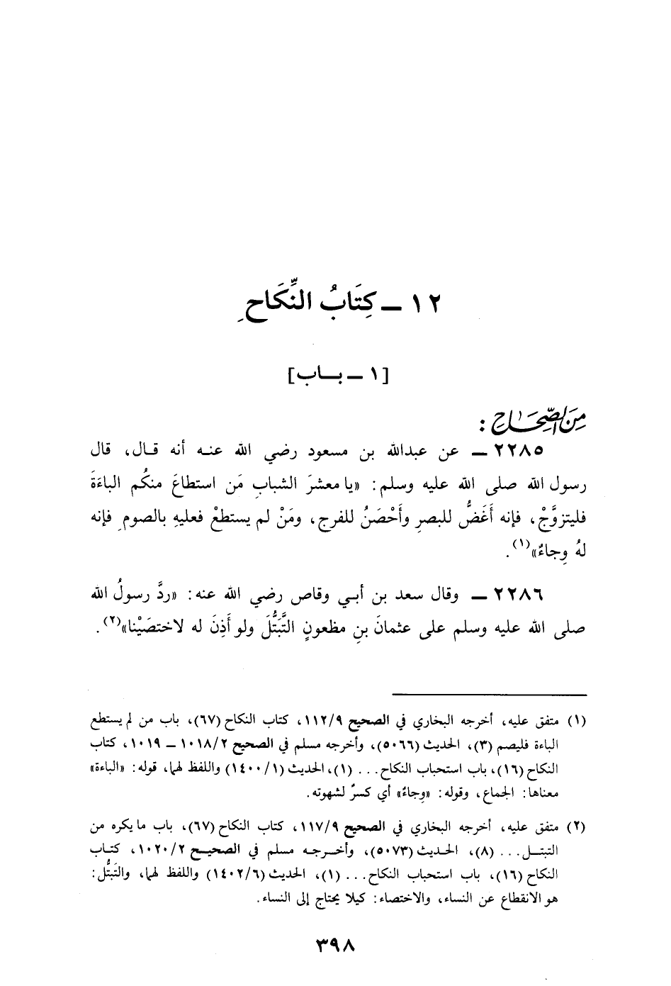 2286 - وقال سعد بن أبي وقاص رضي اللَّه عنه: ردَّ رسولُ اللَّه صلى اللَّه عليه وسلم على عثمانَ بنِ مظعونٍ التَّبَتُّلَ ولو أَذِنَ له لاختَصَيْنا" (¬2).