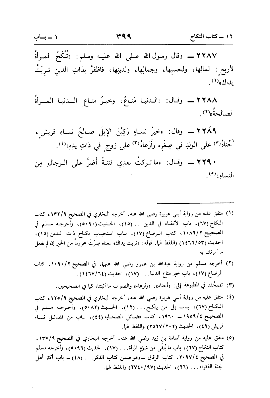 (¬4) متفق عليه من رواية أبي هريرة رضي اللَّه عنه، أخرجه البخاري في الصحيح 9/ 125، كتاب النكاح (67)، باب إلى من ينكح. . . (12)، الحديث (5082)، وأخرجه مسلم في الصحيح 4/ 1959 - 1960، كتاب فضائل الصحابة (44)، باب من فضائل نساء قريش (49)، الحديث (202/ 2527) واللفظ لهما.
