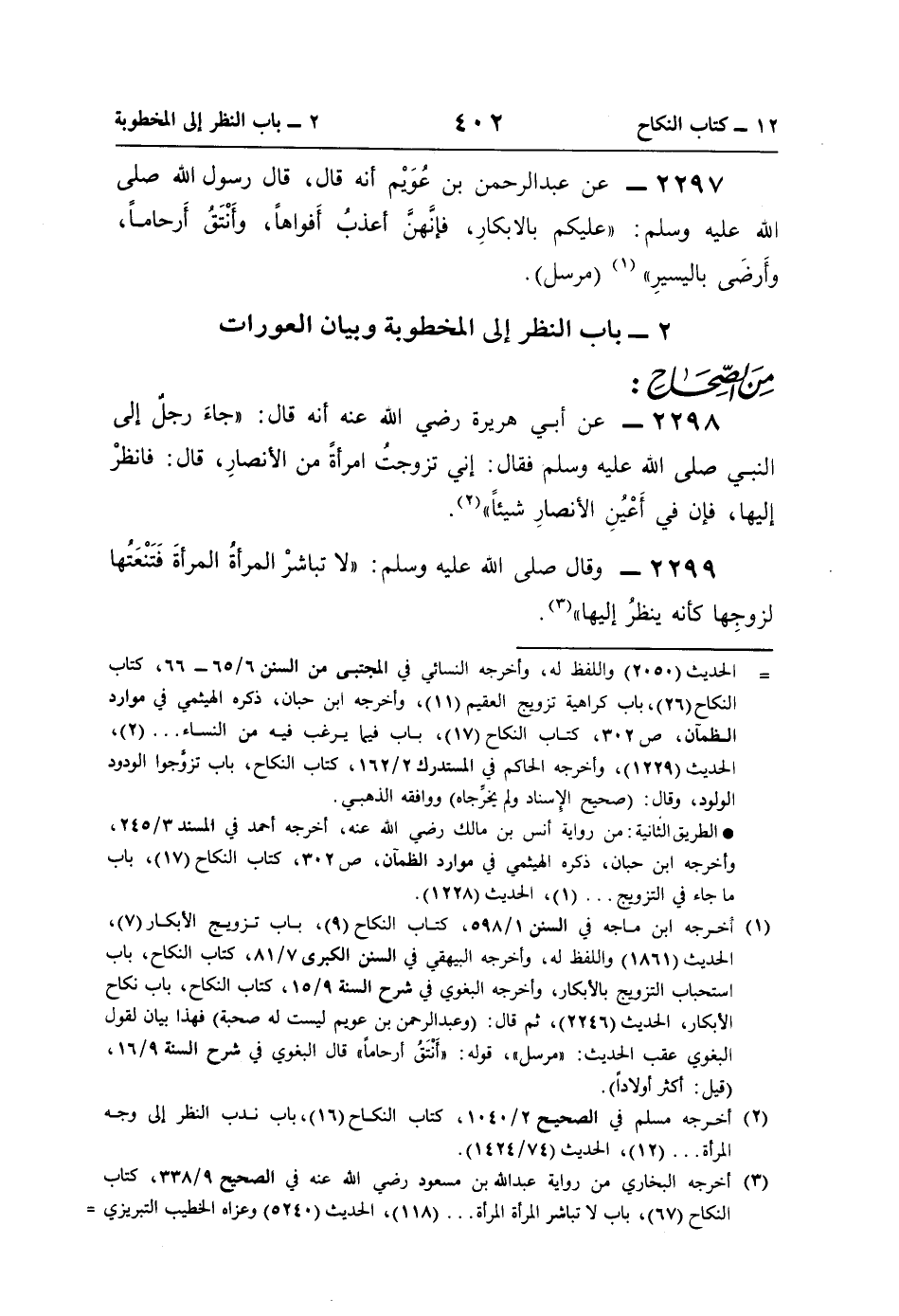 2298 - عن أبي هريرة رضي اللَّه عنه أنّه قال: "جاءَ رجلٌ إلى النبي صلى اللَّه عليه وسلم فقال: إني تزوجتُ امرأةً من الأنصارِ، قال: فانظرْ إليها، فإن في أَعْيُنِ الأنصارِ شيئًا" (¬2).