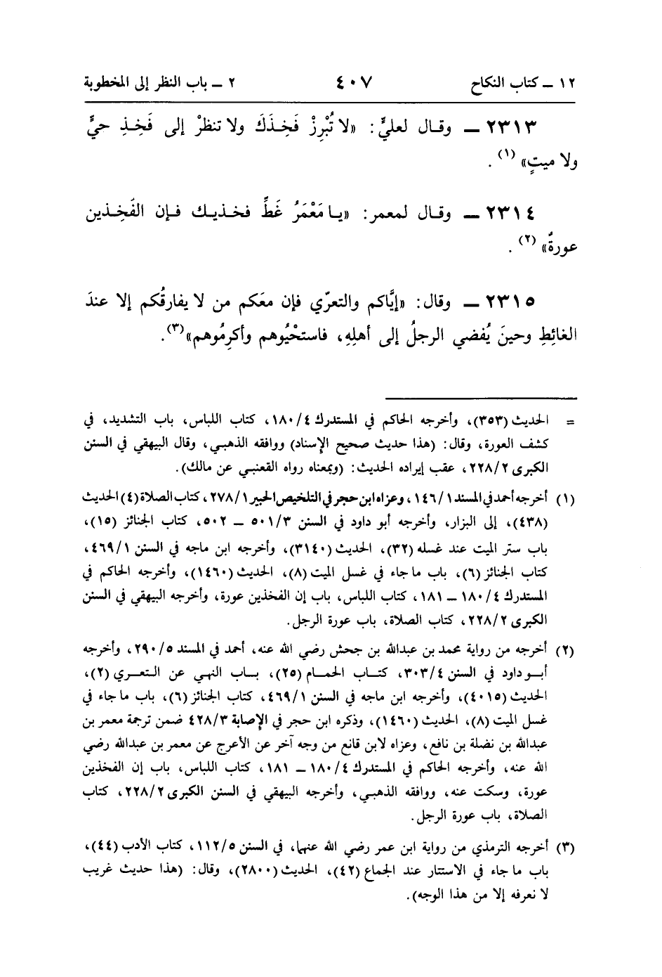 2313 - وقال لعليٍّ: "لا تُبْرِزْ فَخِذَكَ ولا تنظرْ إلى فَخِذِ حيٍّ ولا ميتٍ" (¬1).