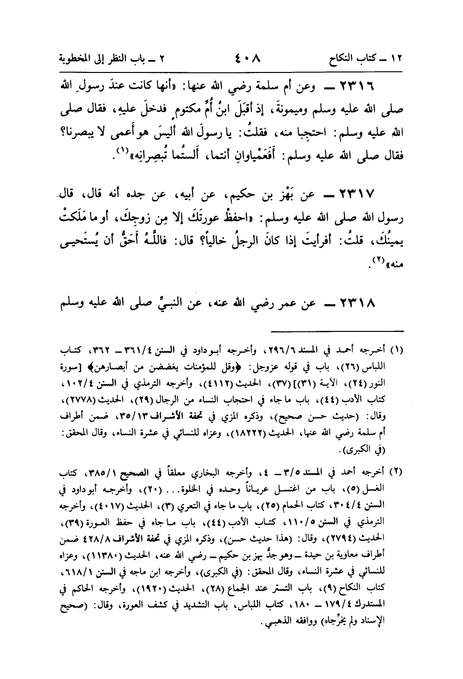 2317 - عن بَهْز بن حكيم، عن أبيه، عن جده أنّه قال، قال رسول اللَّه صلى اللَّه عليه وسلم: "احفظْ عورتَكَ إلّا مِن زوجِكَ، أو ما مَلَكتْ يمينُكَ، قلتُ: أفرأيتَ إذا كانَ الرجلُ خاليًا؟ قال: فاللَّه أَحَقُّ أن يُستَحيى منه" (¬2).