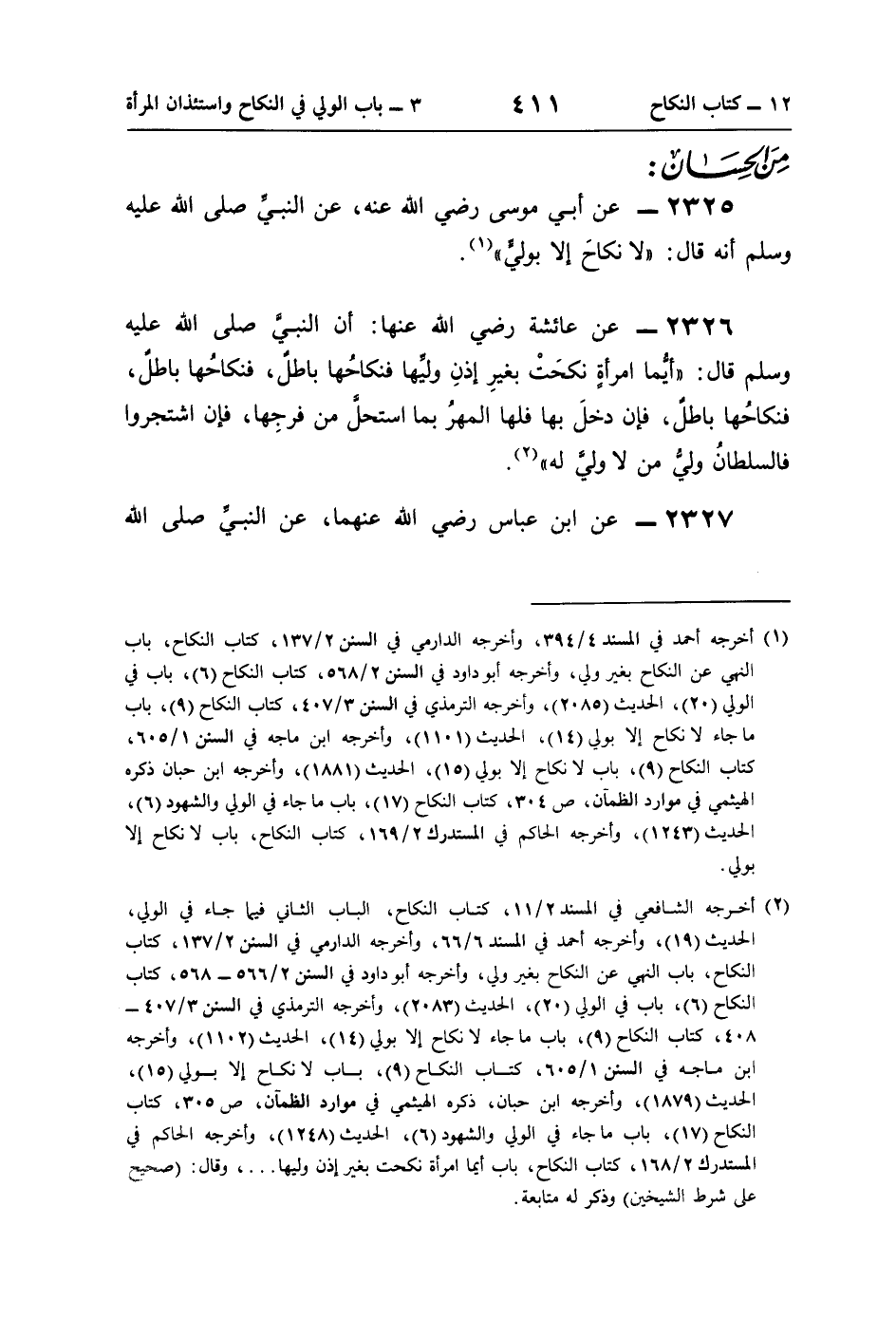 (¬1) أخرجه أحمد في المسند 4/ 394، وأخرجه الدارمي في السنن 2/ 137، كتاب النكاح، باب النهي عن النكاح بغير ولي، وأخرجه أبو داود في السنن 2/ 568، كتاب النكاح (6)، باب في الولي (20)، الحديث (2085)، وأخرجه الترمذي في السنن 3/ 407، كتاب النكاح (9)، باب ما جاء لا نكاح إلّا بولي (14)، الحديث (1101)، وأخرجه ابن ماجه في السنن 1/ 605، كتاب النكاح (9)، باب لا نكاح إلّا بولي (15)، الحديث (1881)، وأخرجه ابن حبان ذكره الهيثمي في موارد الظمآن، ص 304، كتاب النكاح (17)، باب ما جاء في الولي والشهود (6)، الحديث (1243)، وأخرجه الحاكم في المستدرك 2/ 169، كتاب النكاح، باب لا نكاح إلّا بولي.