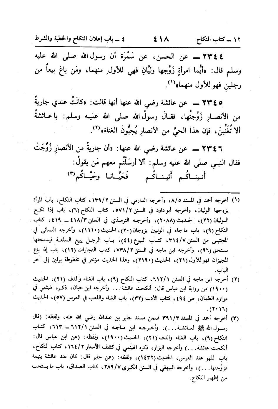 (¬2) أخرجه ابن ماجه في السنن 1/ 612، كتاب النكاح (9)، باب الغناء والدف (21)، الحديث (1900) من رواية ابن عباس قال: أنكحت عائشة. . . وأخرجه ابن حبان، ذكره الهيثمي في موارد الظمآن، ص 494، كتاب الأدب (32)، باب الغناء واللعب في العرس (57)، الحديث (2016).