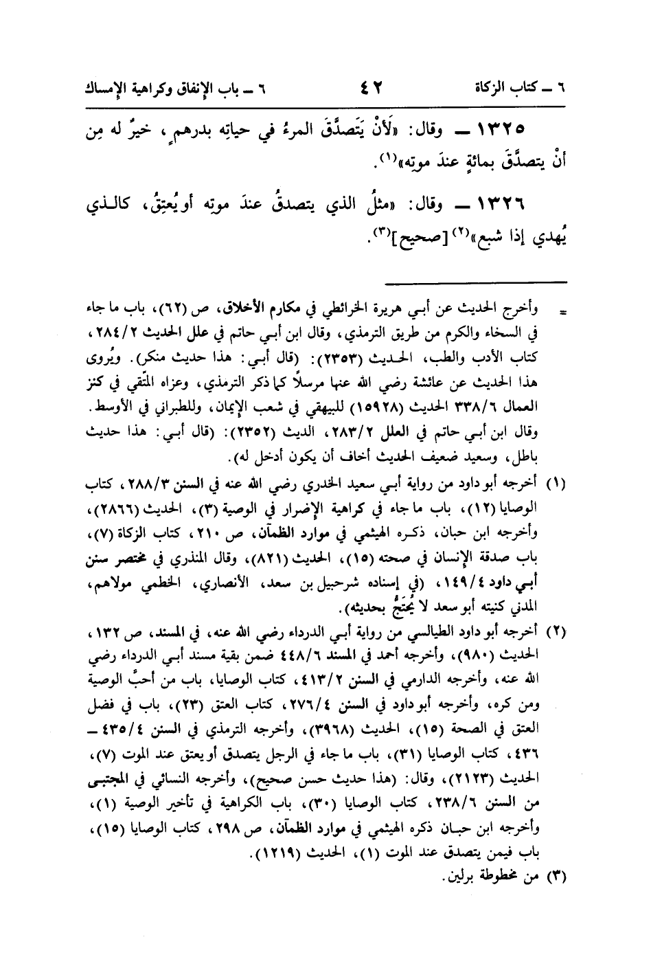 1326 - وقال: "مثلُ الذي يتصدقُ عندَ موته أو يُعتِقُ، كالذي يُهدي إذا شبع" (¬2) [صحيح] (¬3).