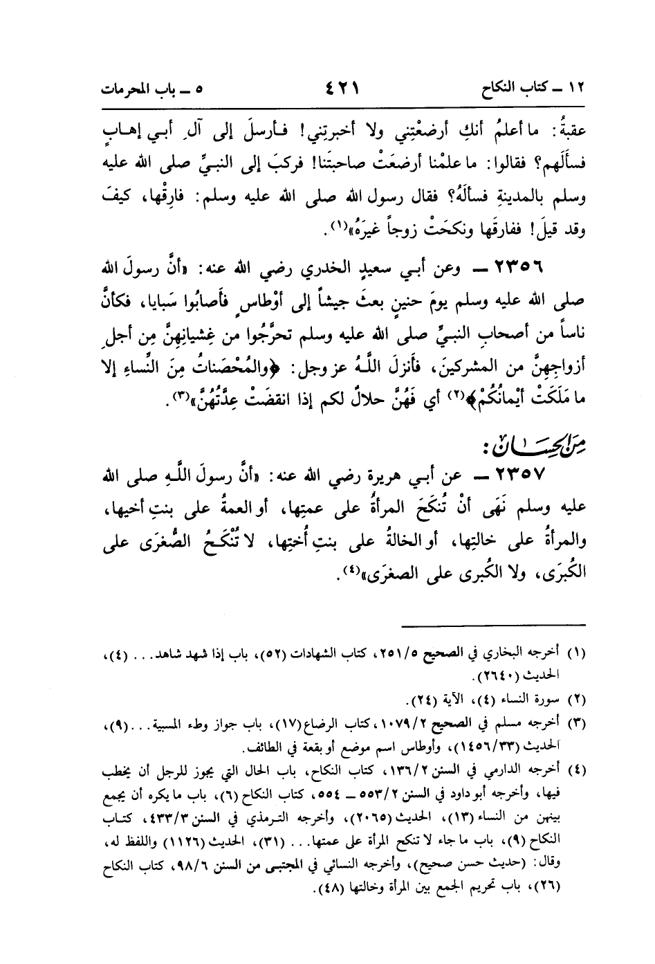 2357 - عن أبي هريرة رضي اللَّه عنه: "أنَّ رسولَ اللَّه صلى اللَّه عليه وسلم نَهَى أنْ تُنكَحَ المرأةُ على عمتِها، أو العمةُ على بنتِ أخيها، والمرأةُ على خالتِها، أو الخالةُ على بنتِ أُختِها، لا تُنْكَحُ الصُّغرَى على الكُبرَى، ولا الكُبرى على الصغرَى" (¬4).