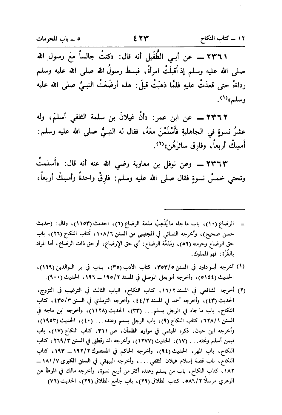 2363 - وعن نوفل بن معاوية رضي اللَّه عنه أنّه قال: "أَسلمتُ وتحتي خمسُ نسوةٍ فقال صلى اللَّه عليه وسلم: فارِقْ واحدةً وأمسِكْ أربعًا،