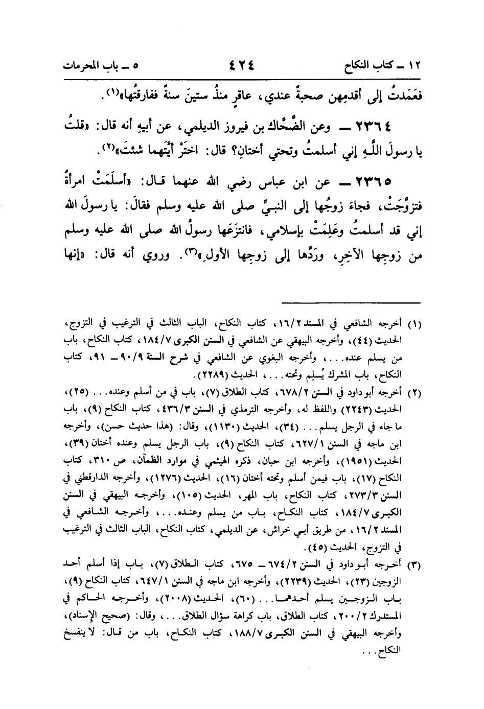 2364 - وعن الضَّحَّاك بن فيروز الديلمي، عن أبيهِ أنّه قال: "قلتُ يا رسولَ اللَّه إني أسلمتُ وتحتي أختانِ؟ قال: اختَرْ أيَّتَهما شئتَ" (¬2).