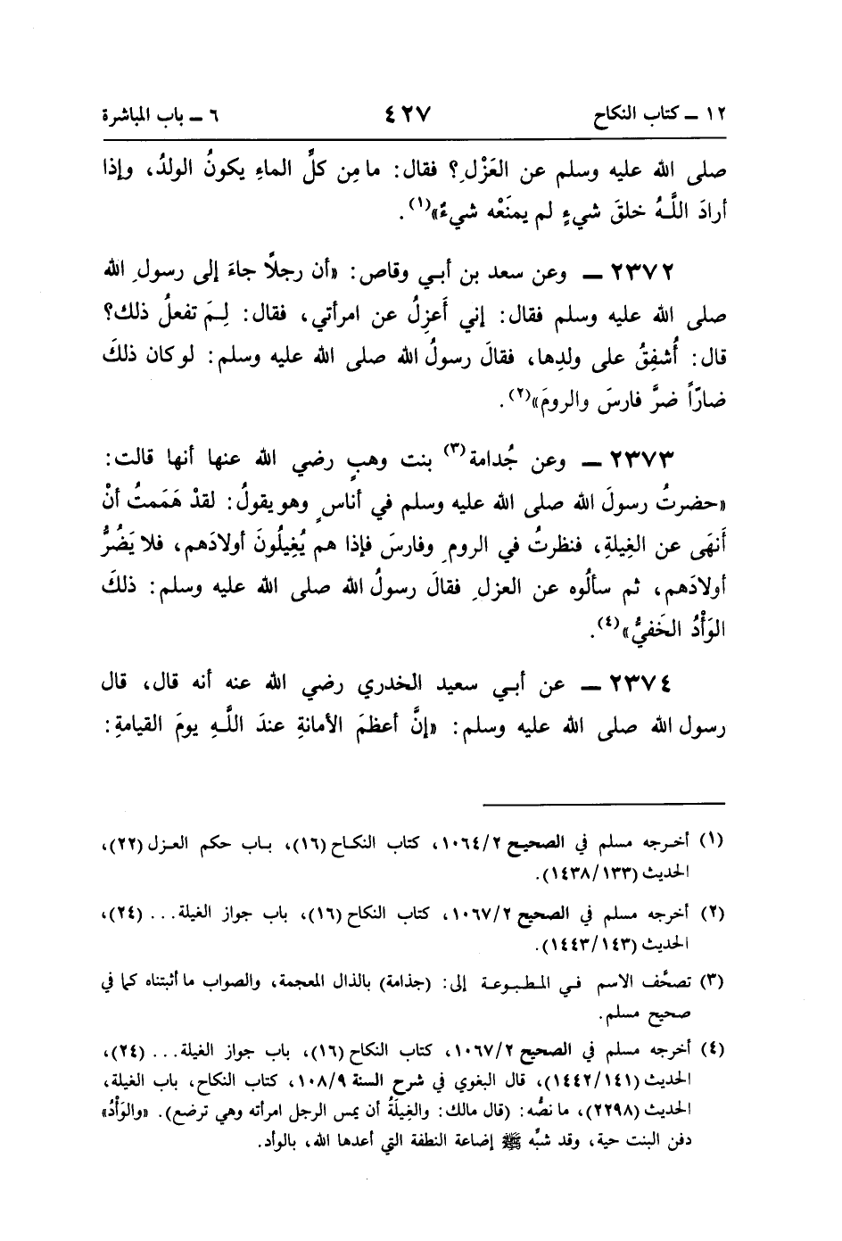 (¬1) أخرجه مسلم في الصحيح 2/ 1064، كتاب النكاح (16)، باب حكم العزل (22)، الحديث (133/ 1438).