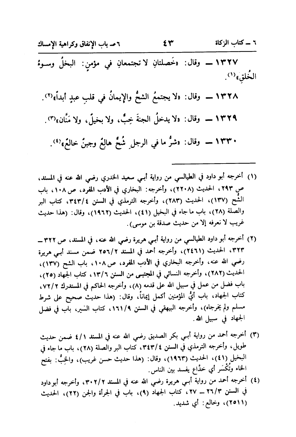 (¬1) أخرجه أبو داود في الطيالسي من رواية أبي سعيد الخدري رضي اللَّه عنه في المسند، ص 293، الحديث (2208)، وأخرجه: البخاري في الأدب المفرد، ص 108، باب الشُّح (137)، الحديث (283)، وأخرجه الترمذي في السنن 4/ 343، كتاب البر والصلة (28)، باب ما جاء في البخيل (41)، الحديث (1962)، وقال: (هذا حديث غريب لا نعرفه إلا من حديث صدقة بن موسى).