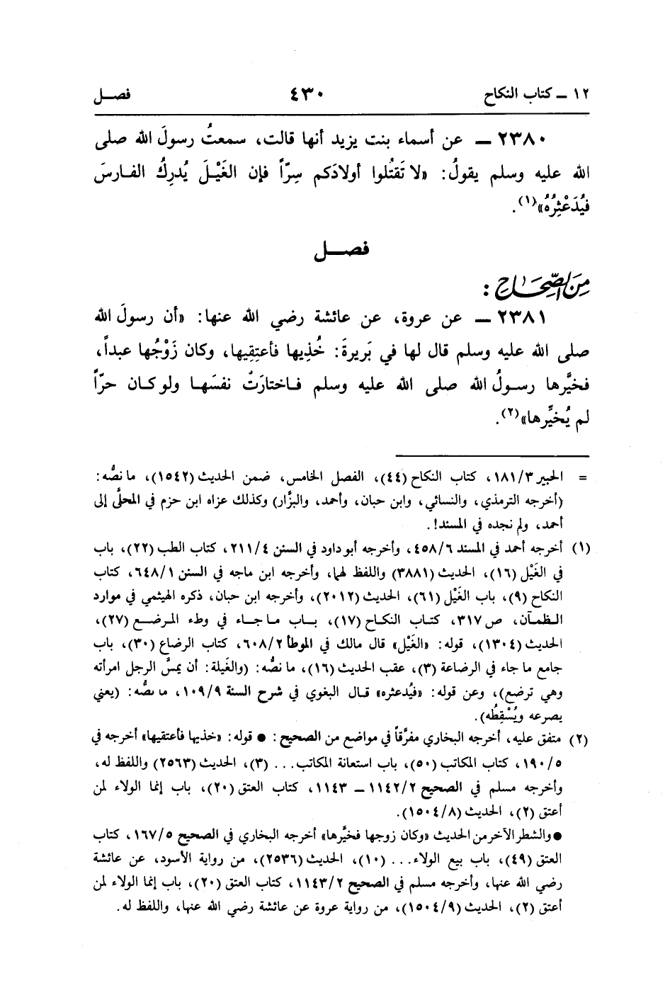 2381 - عن عروة، عن عائشة رضي اللَّه عنها: "أنَّ رسولَ اللَّه صلى اللَّه عليه وسلم قال لها في بَريرةَ: خُذِيها فأعتِقِيها، وكان زَوْجُها عبدًا، فخيَّرها رسولُ اللَّه صلى اللَّه عليه وسلم فاختارَتْ نفسَها ولو كان حرًّا لم يُخيِّرها" (¬2).