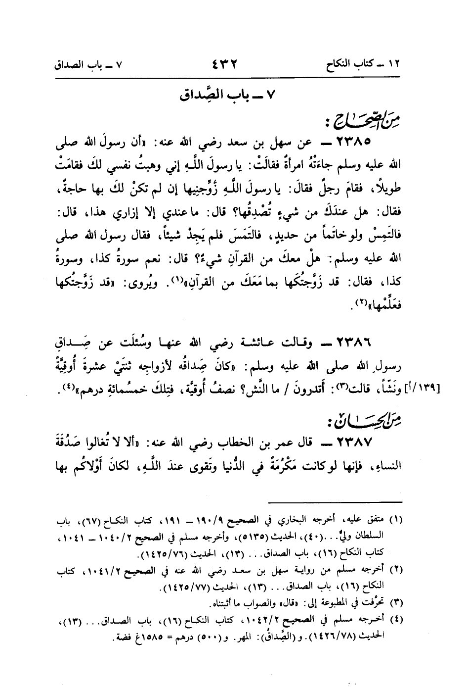 (¬4) أخرجه مسلم في الصحيح 2/ 1042، كتاب النكاح (16)، باب الصداق. . . (13)، الحديث (78/ 1426). و (الصَّداقُ): المهر. و (500) درهم = 1585 غ فضة.
