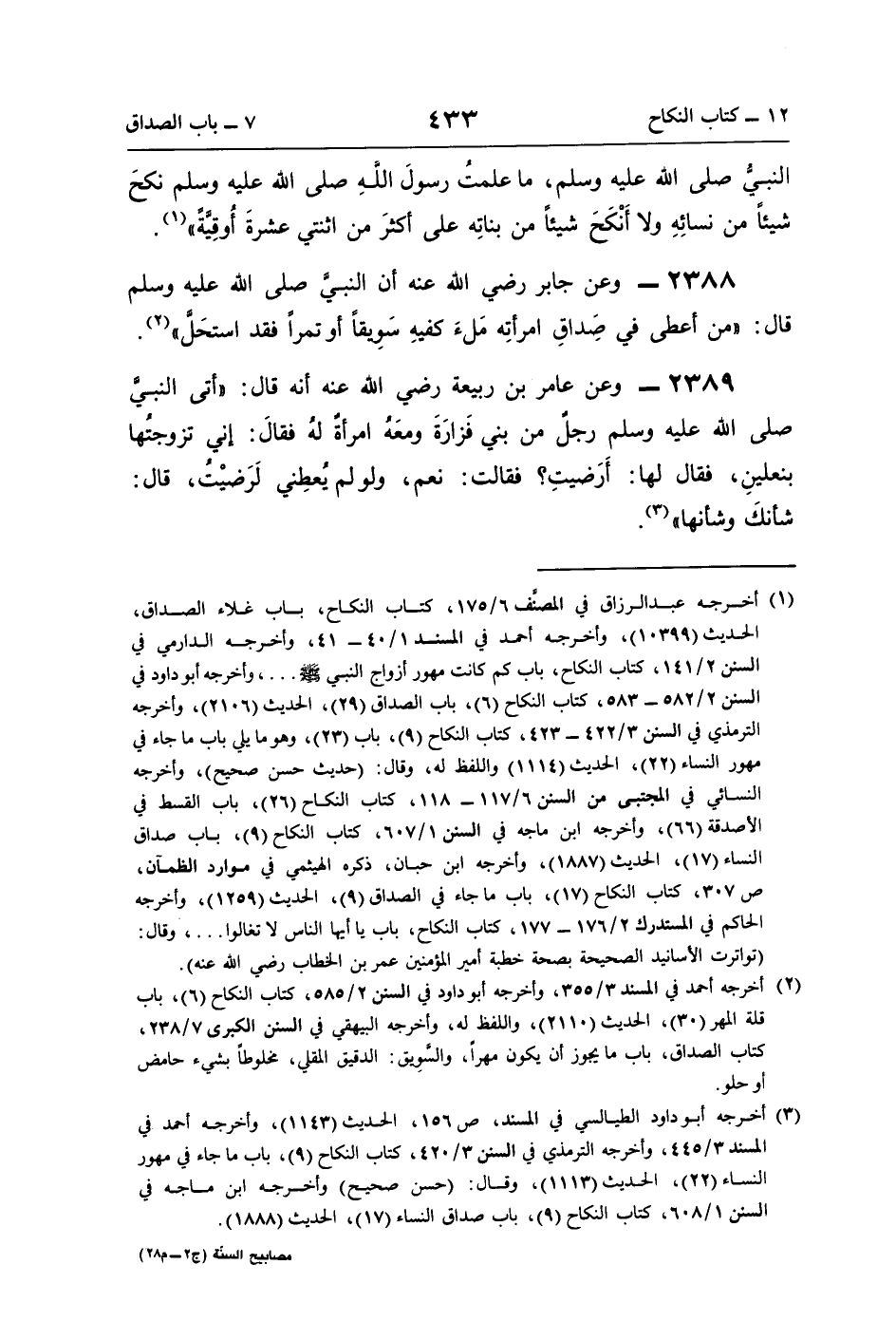 (¬3) أخرجه أبو داود الطيالسي في المسند، ص 156، الحديث (1143)، وأخرجه أحمد في المسند 3/ 445، وأخرجه الترمذي في السنن 3/ 420، كتاب النكاح (9)، باب ما جاء في مهور النساء (22)، الحديث (1113)، وقال: (حسن صحيح) وأخرجه ابن ماجه في السنن 1/ 608، كتاب النكاح (9)، باب صداق النساء (17)، الحديث (1888).